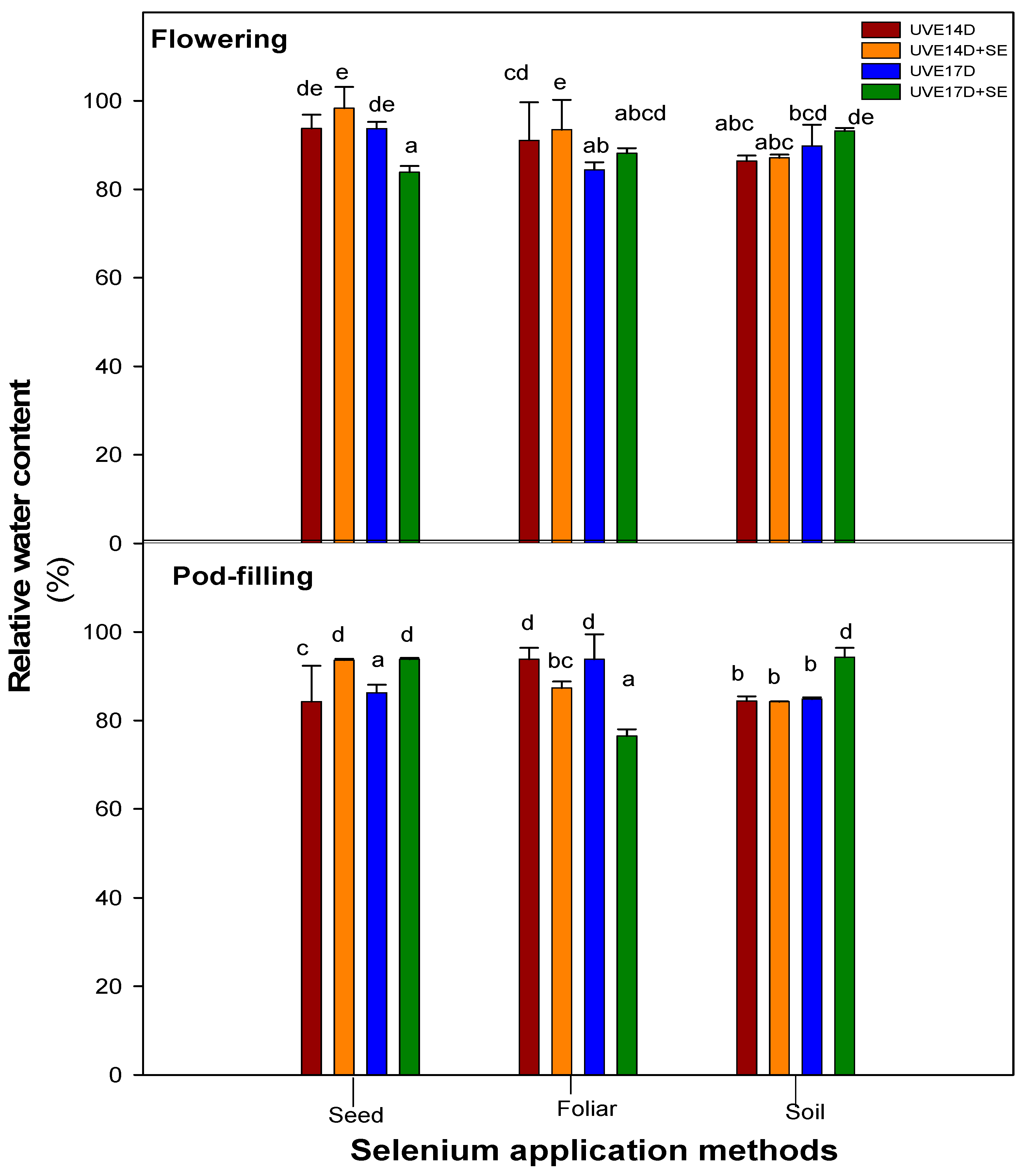 2 fixation, as indicated by higher stomatal conductance at the pod-filling stage. Notably, RWC at this stage improved despite increased stomatal opening, suggesting that this selenium application method may have activated additional drought tolerance mechanisms that prevent desiccation, thereby enhancing RWC, consistent with the findings of Sita et al. [
