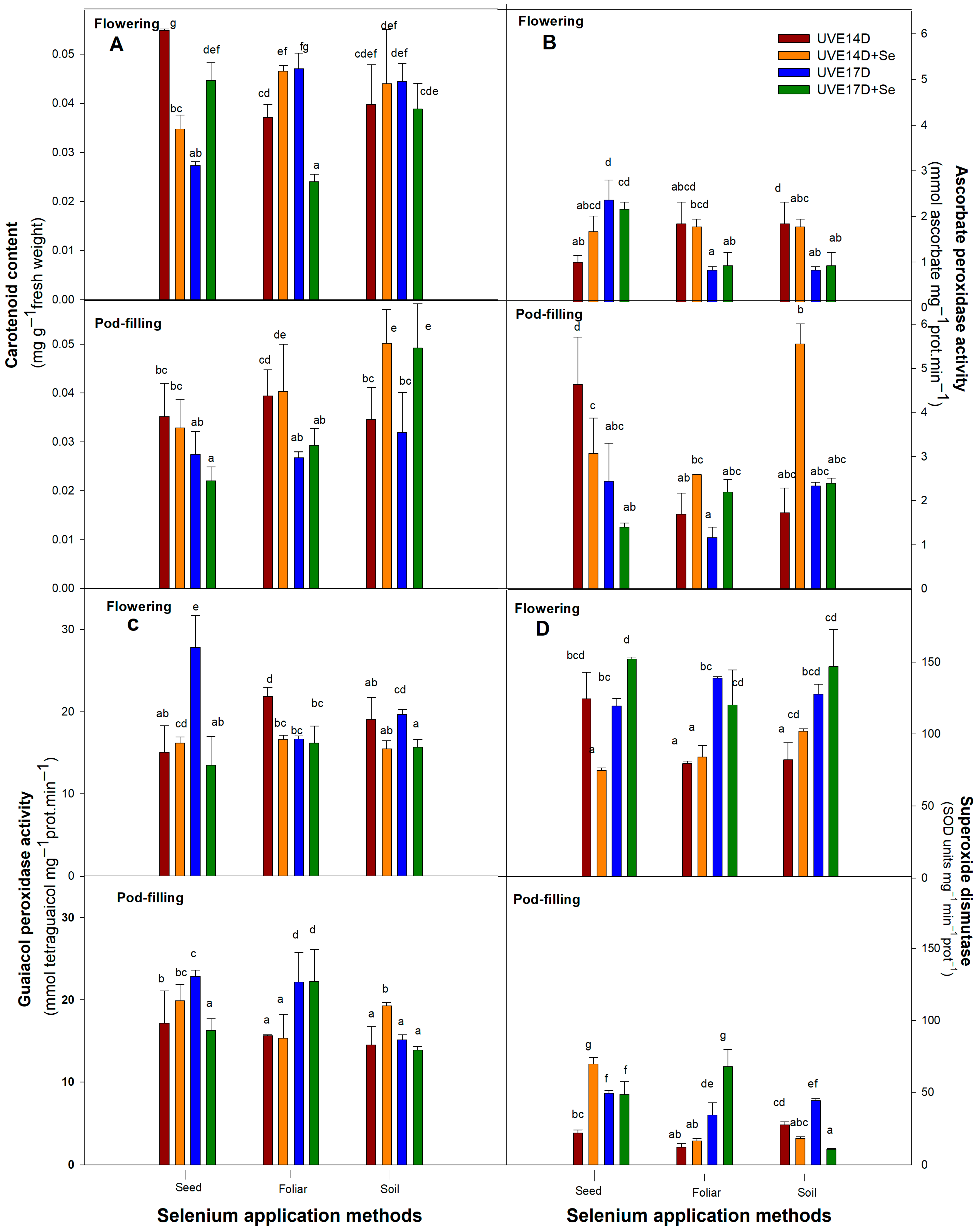 36]. However, further investigations are needed to clarify the mechanisms used by drought-stressed UVE14 to maintain high RWC in drought-stressed UVE14 under the selenium seed priming method. Although carotenoid content declined in this cultivar under drought stress and selenium treatment at flowering, other ROS scavenging mechanisms, particularly increased GPX activity at flowering and SOD activity at pod-filling, effectively neutralised H