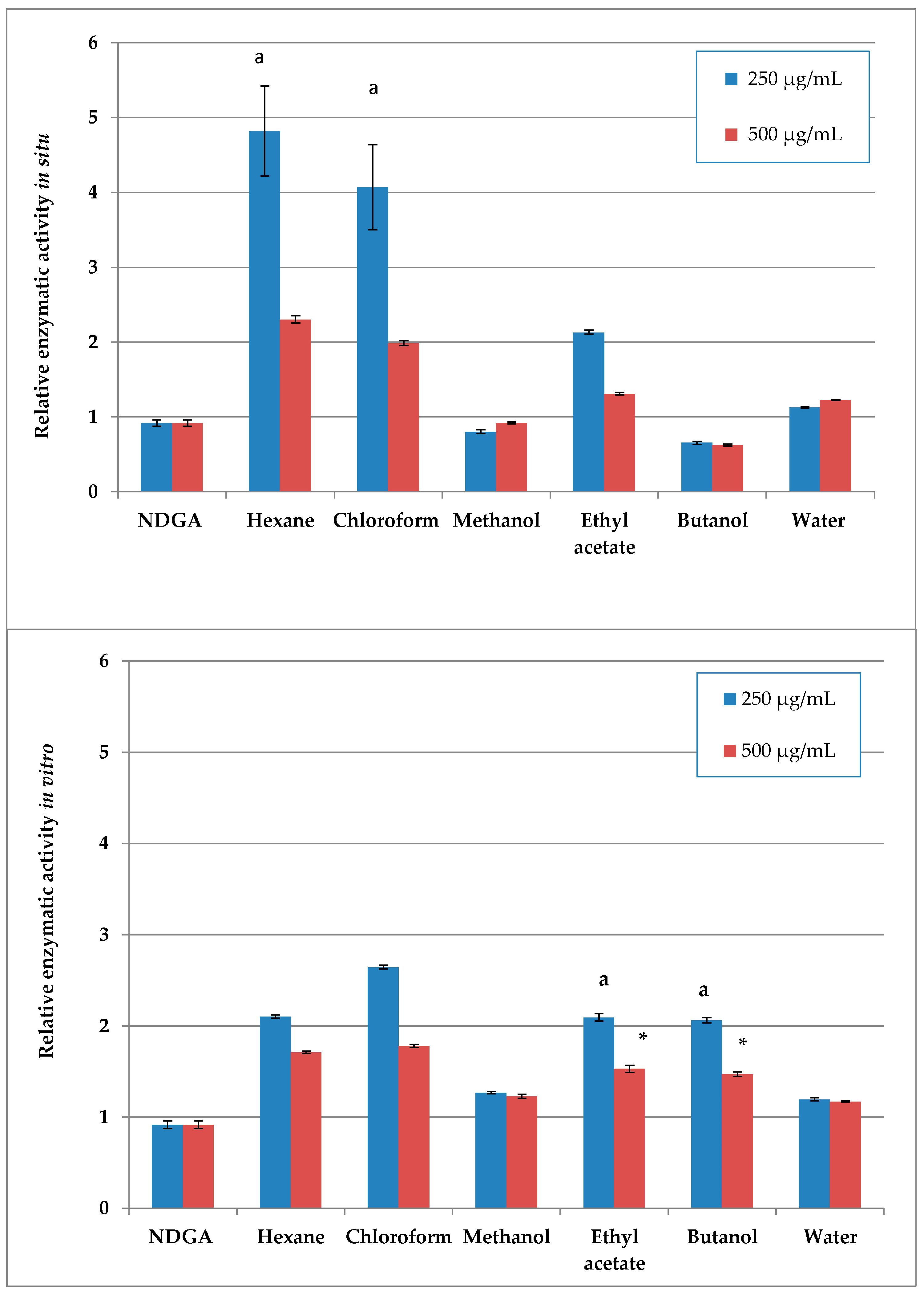 28]. In order to select the most potent of the preparations in the two tested concentrations, we compared their activity with the one of the NDGA concentrations exhibiting IC