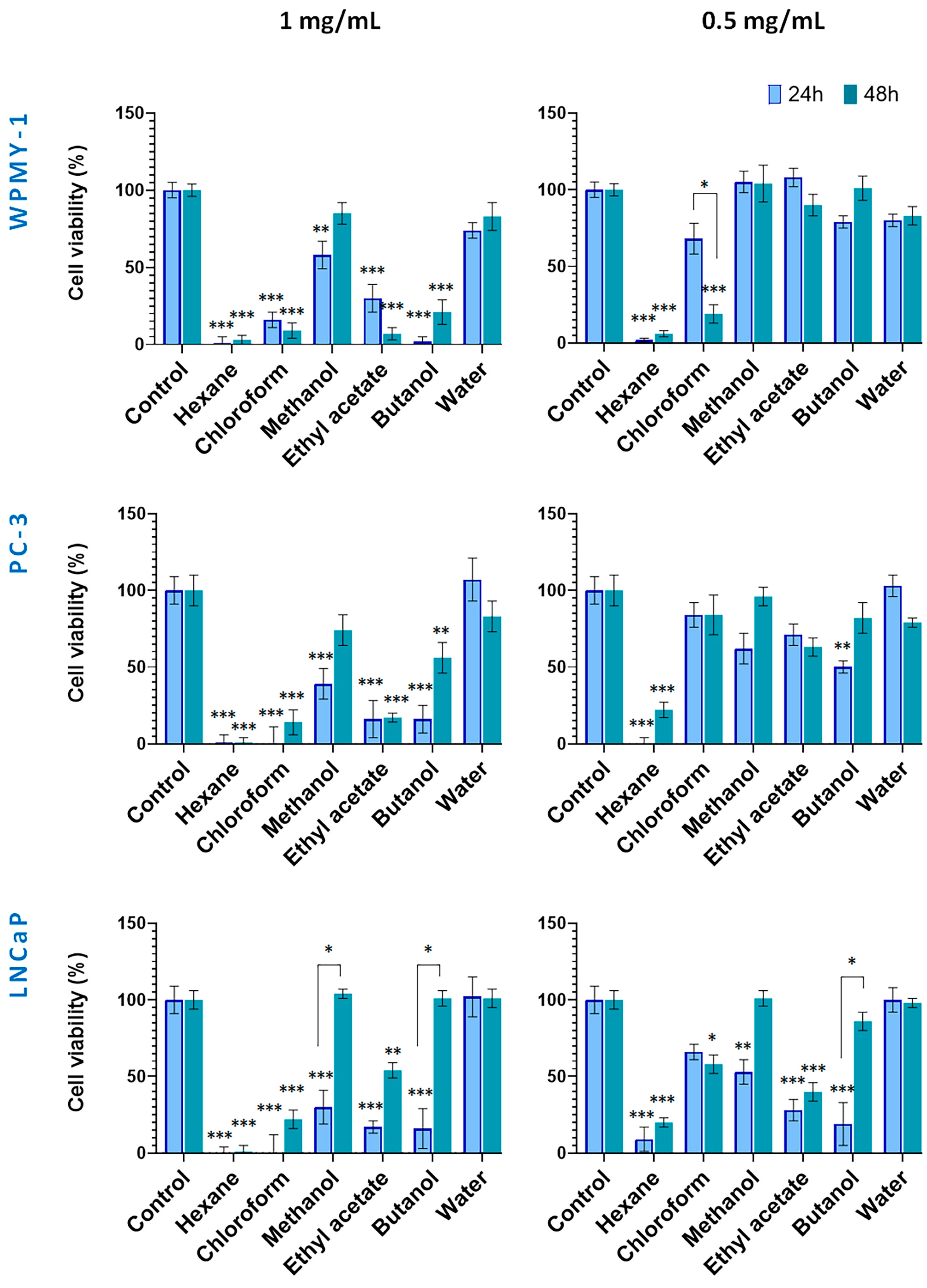 The cytotoxic activity of S. scardica extracts and fractions was evaluated using two human prostate cancer cell lines, PC-3 (epithelial adenocarcinoma, Grade IV) and LNCaP (epithelial carcinoma), as well as a normal human prostate stromal cell line, WPMY (epithelial fibroblast/myofibroblast). All cell lines were obtained from the American Type Culture Collection (ATCC, Manassas, VA, USA). PC-3 and WPMY cells were cultured in low-glucose DMEM supplemented with 10% and 5% FBS, respectively. LNCaP cells were maintained in RPMI-1640 medium supplemented with 10% FBS.
