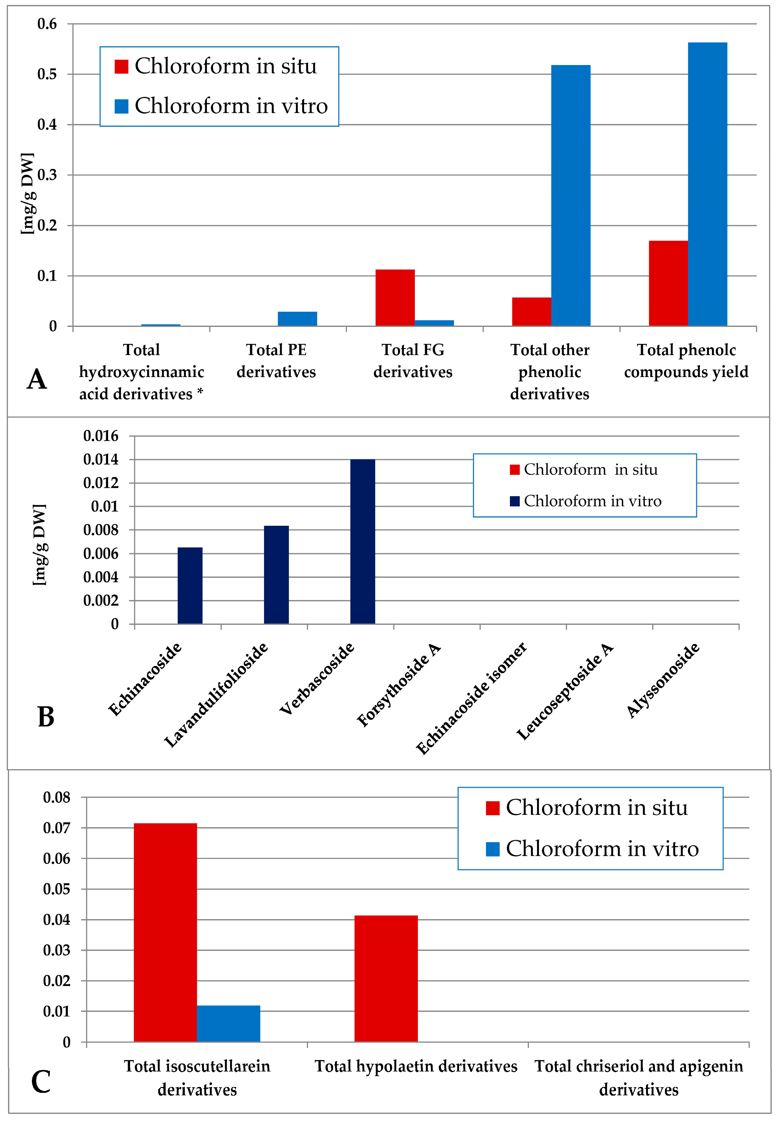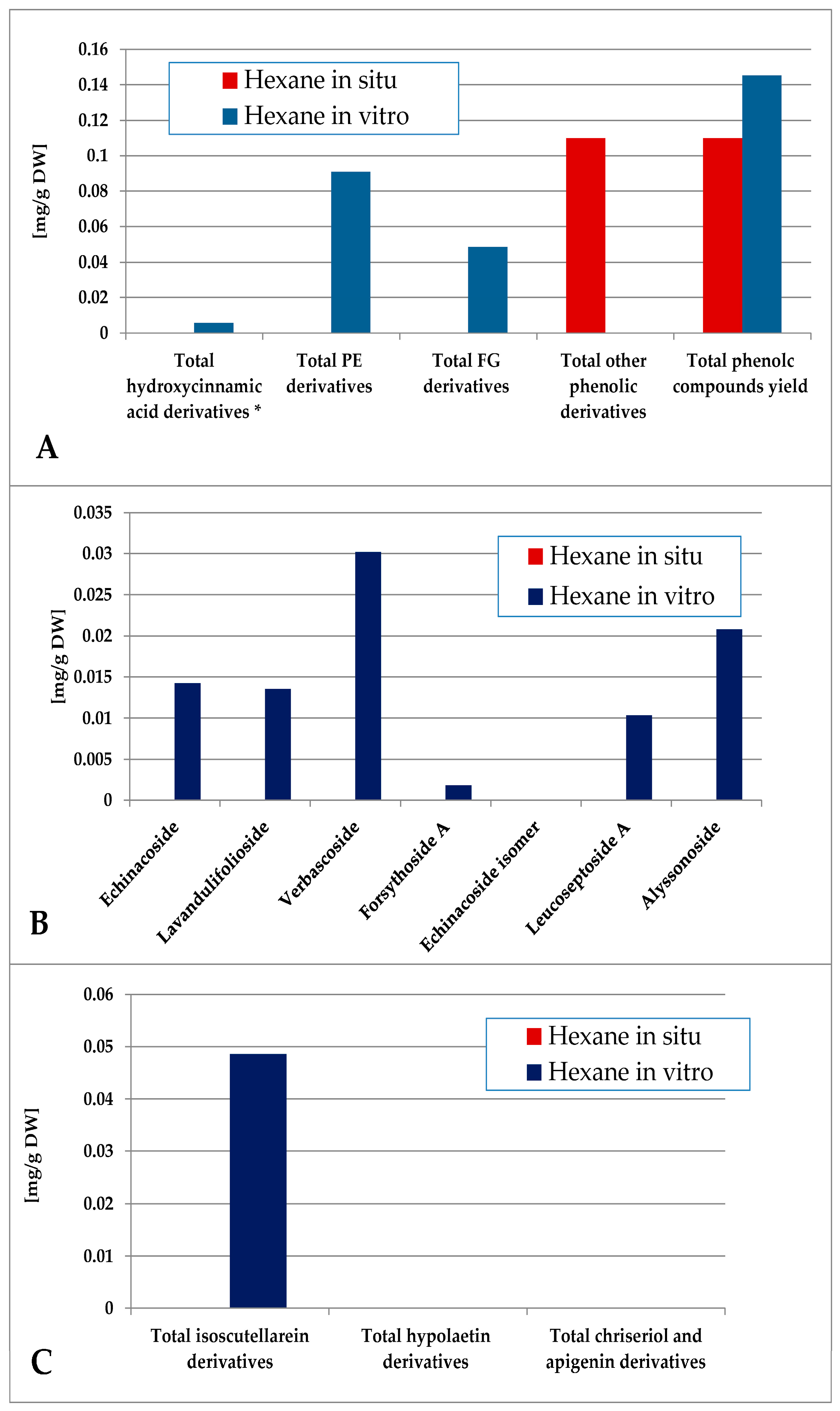 The sum of total phenolic compound yield in all in situ plant preparations was 136.29 mg/g DW, and 43.05 mg/g DW for all in vitro preparations (