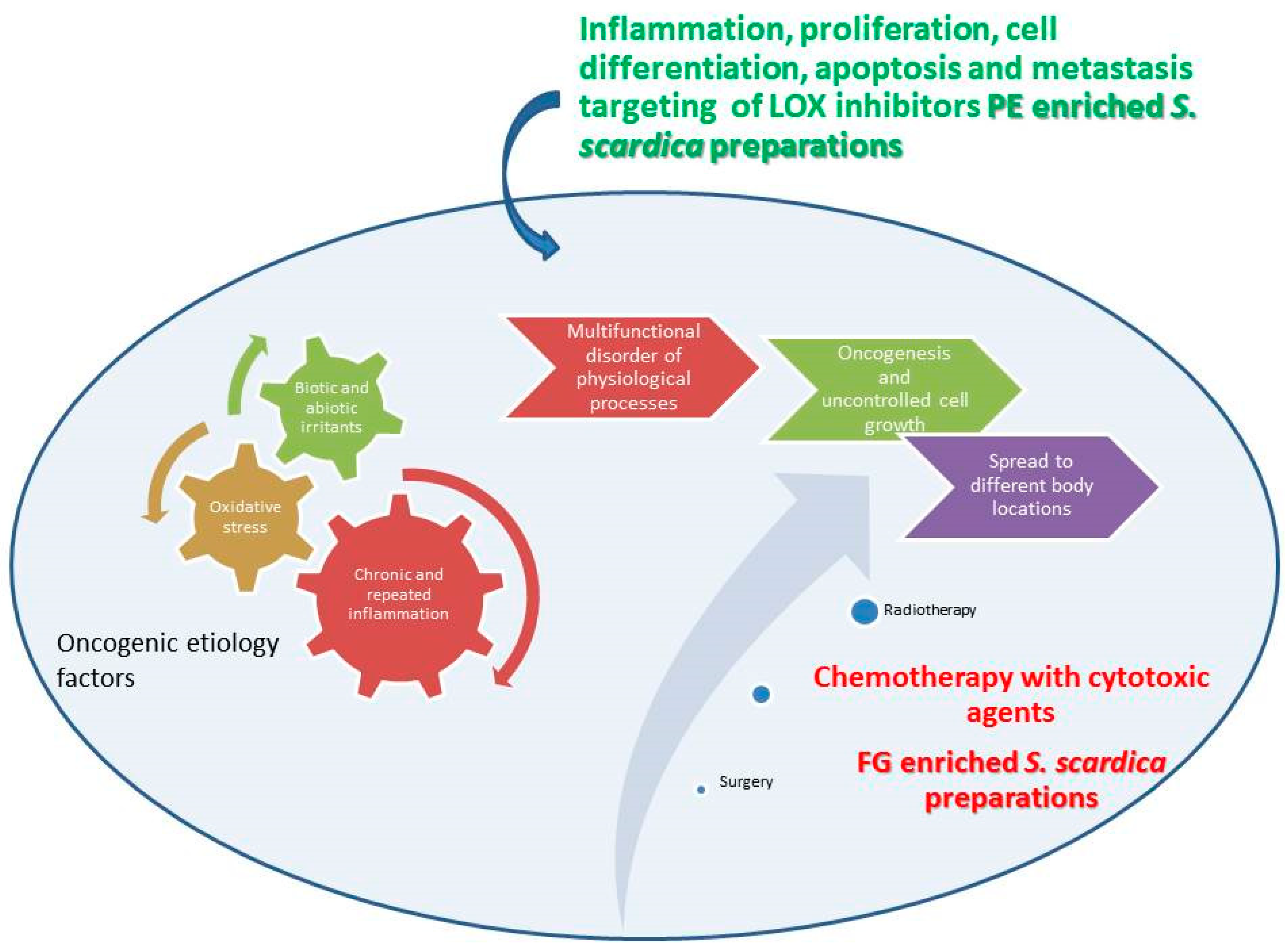 Sideritis preparations and direct cytotoxicity of FG-enriched preparations, outlining the potential of PE-enriched preparations to target rather the LOX-related events of oncogenic etiology and FG-enriched preparations and thus exhibit higher relevance as direct cytotoxic agents (