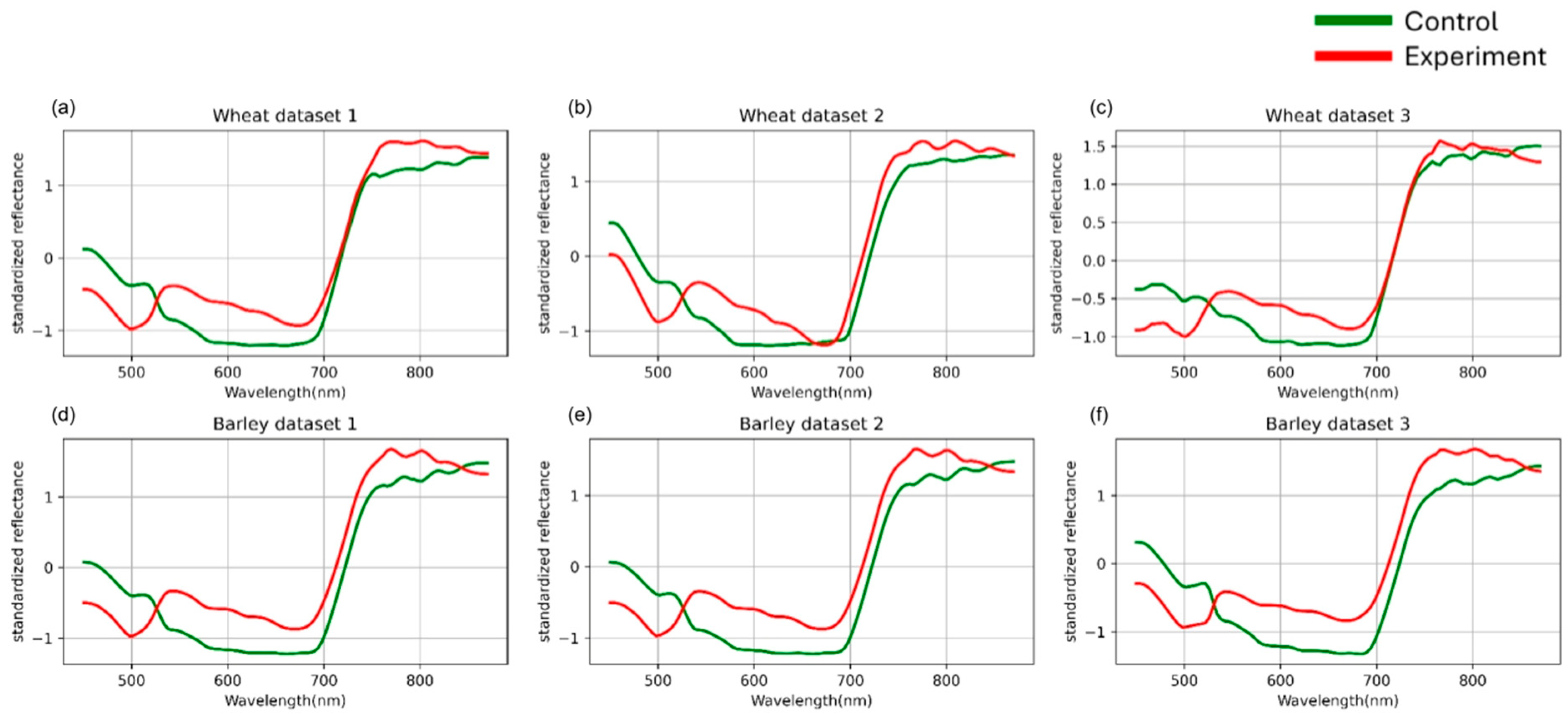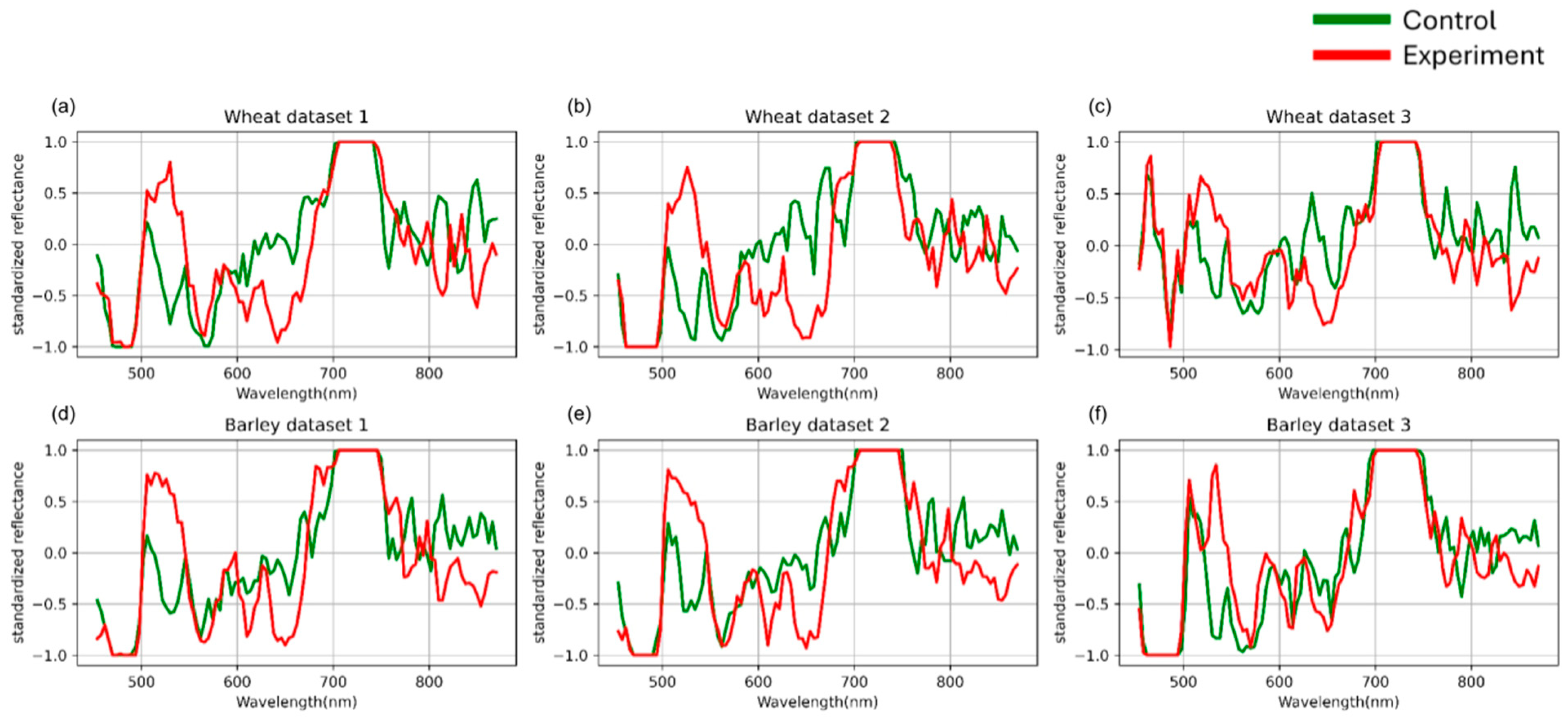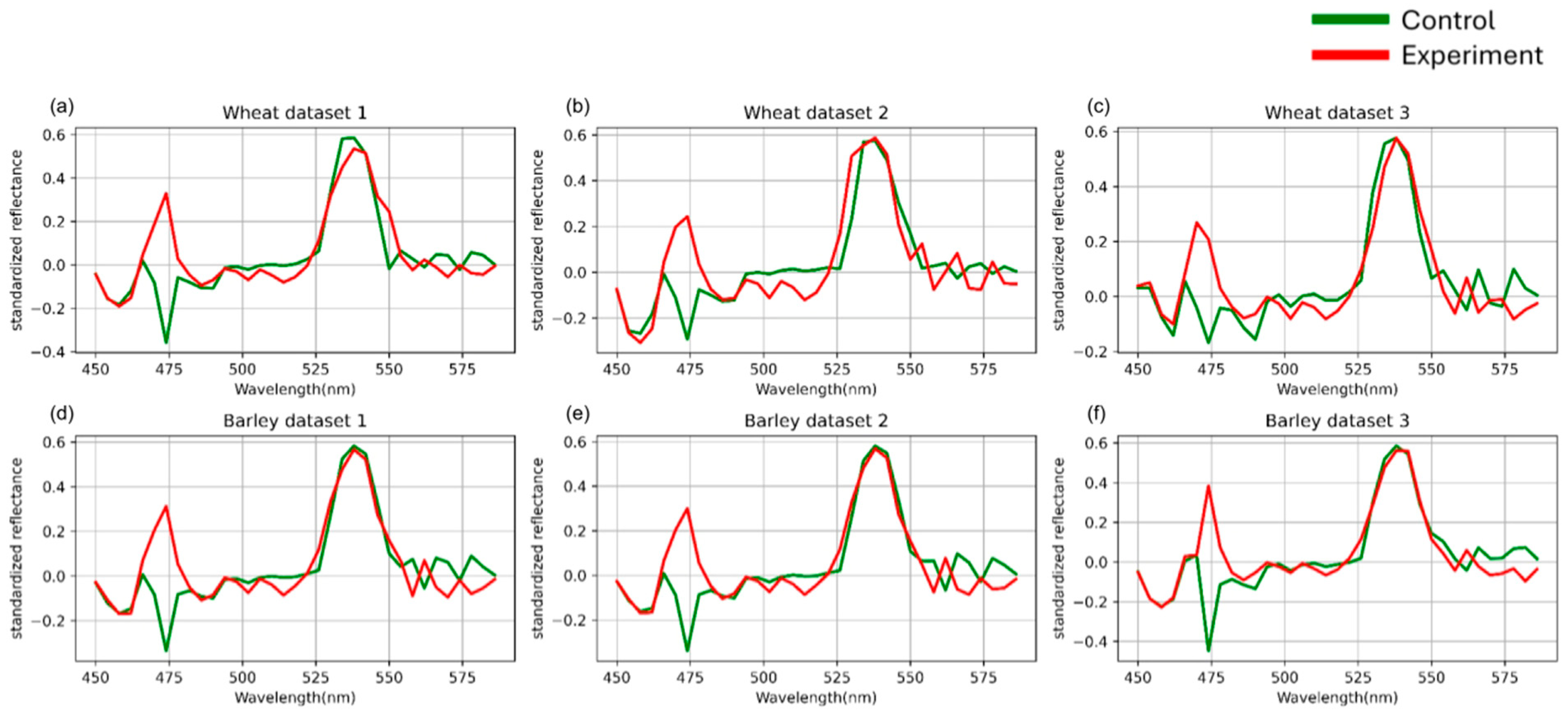61]. The next step, standardization of the averaged curves, eliminated individual differences between samples not related to the biological state of the plants. In particular, it leveled the influence of morphological features such as leaf thickness or its angle relative to the light source. This is especially important for intercultural comparisons, where the physical structure of wheat and barley leaves differs in thickness, cuticle density, and vein orientation [