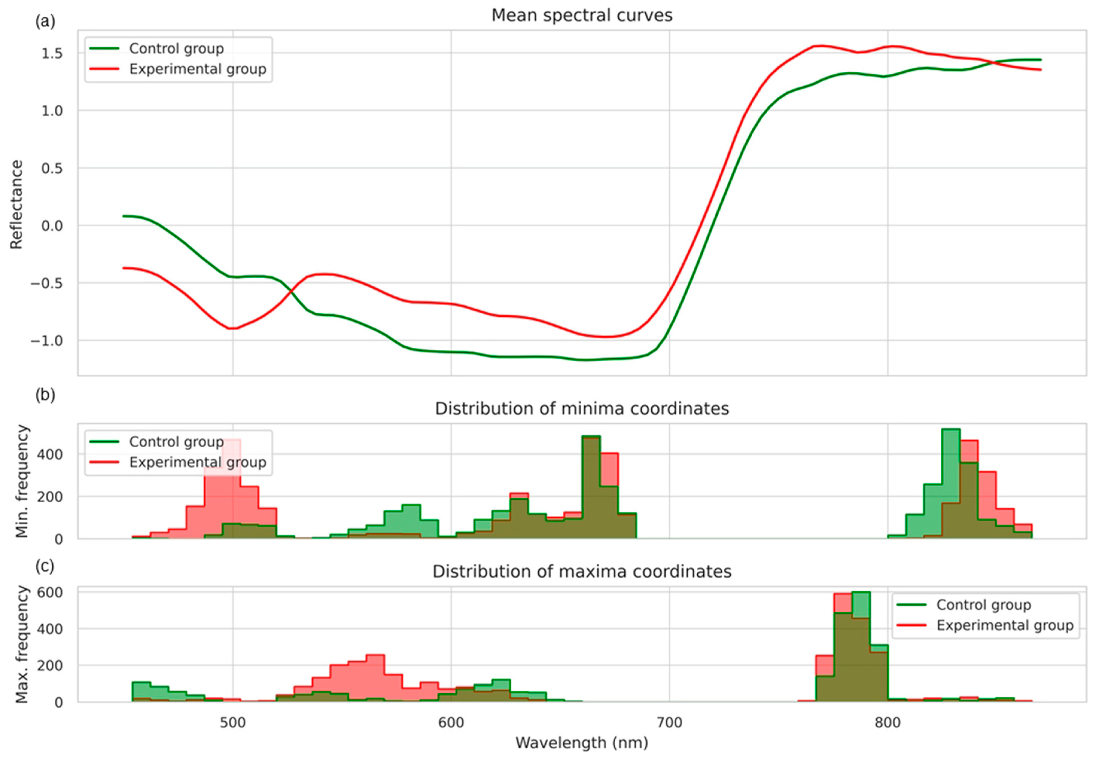 Based on features such as the extrema corresponding wavelengths, the number of maxima and minima, and the average distance between adjacent extrema, the objects from the control and experimental groups could be effectively distinguished. Using these informative characteristics, a new feature space describing the morphology of spectral curves was constructed, while maintaining a significantly lower dimensionality compared to the original hyperspectral data.