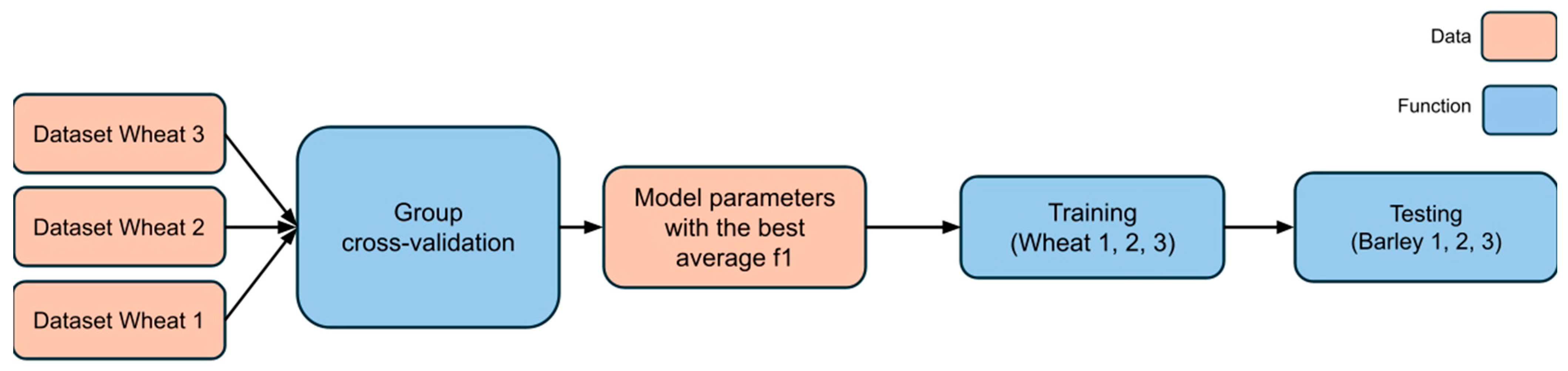 Figure 8), obtained from cross-validation on the wheat datasets, was subsequently tested on two independent barley datasets. This allowed for an objective assessment of the model’s ability to generalize to a new type of input data.