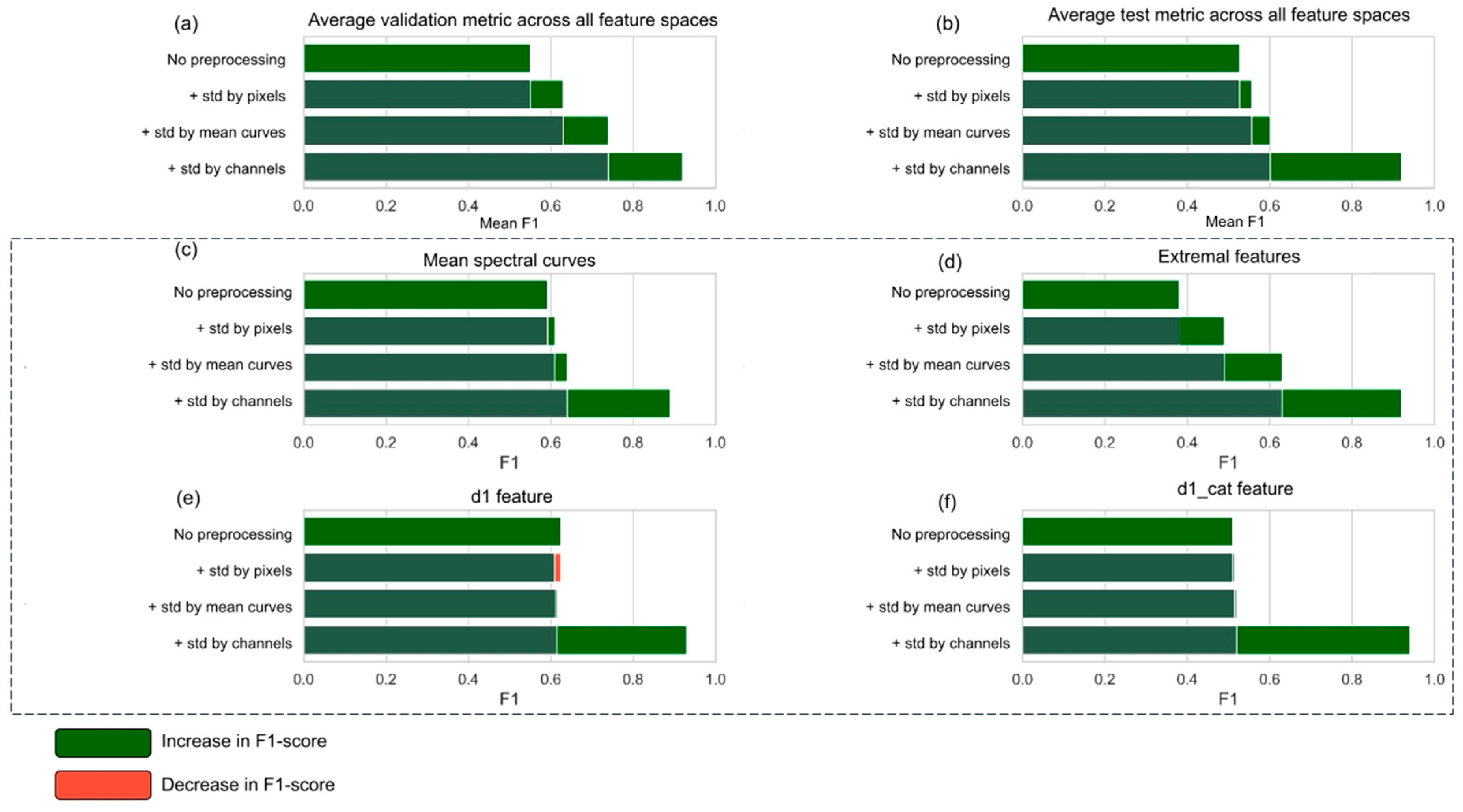 For all feature spaces, the effect of the preprocessing stages on the F1-score was evaluated (