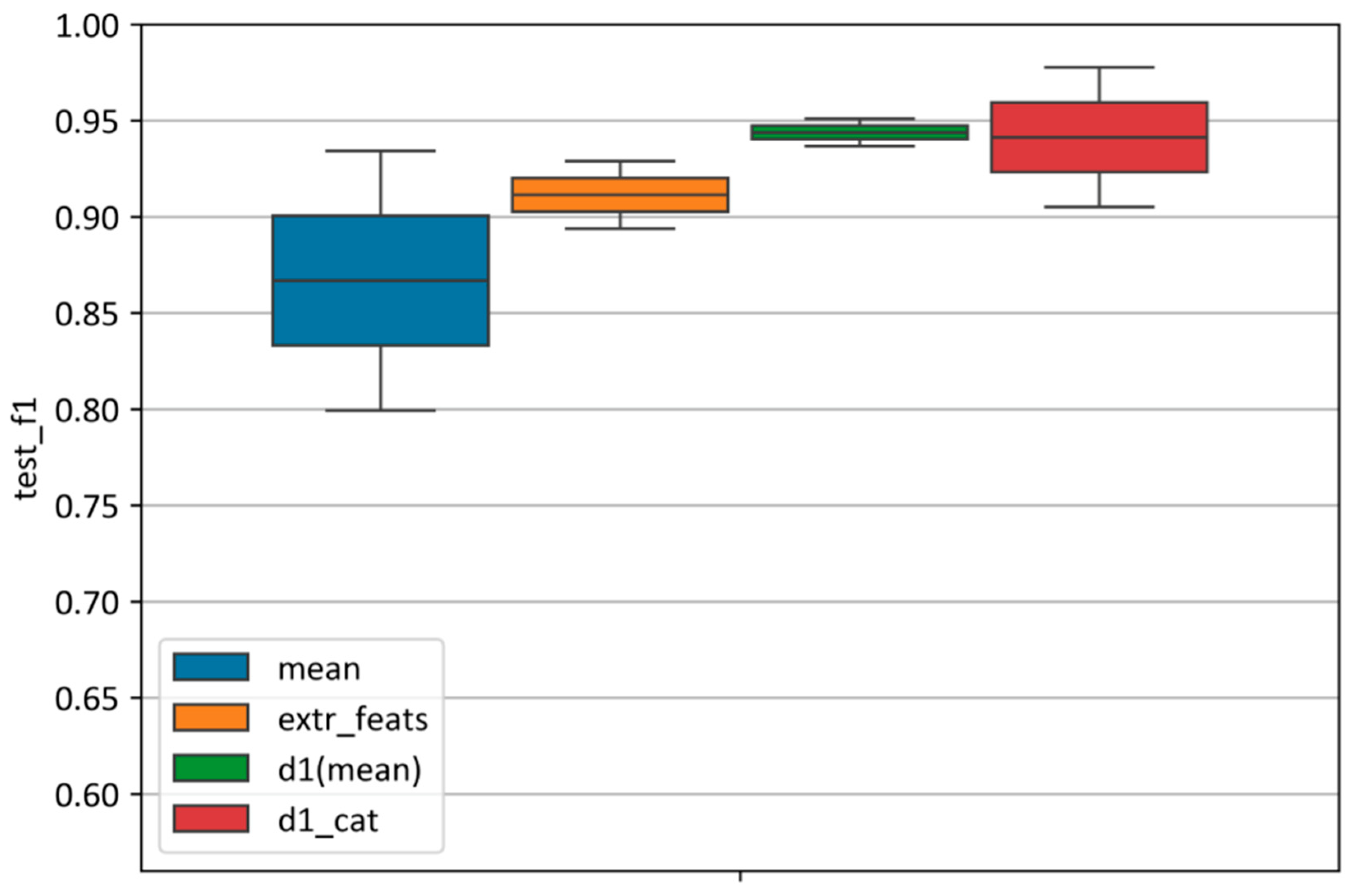 Figure 10 illustrates the differences in classification performance among the four feature spaces. Features derived from mean spectral curves achieved an F1-score of 0.87 on the test set, though with the widest variability (ranging from 0.80 to 0.94). In contrast, extremal features provided a more stable performance (F1 ≈ 0.91), with a narrower range (0.90–0.93). The first-order derivatives yielded the most stable and highest classification accuracy (F1 = 0.94), with a very tight range (0.94–0.95). The categorical first-order derivatives also reached a high score (F1 = 0.94), but with greater variability (0.91–0.98).