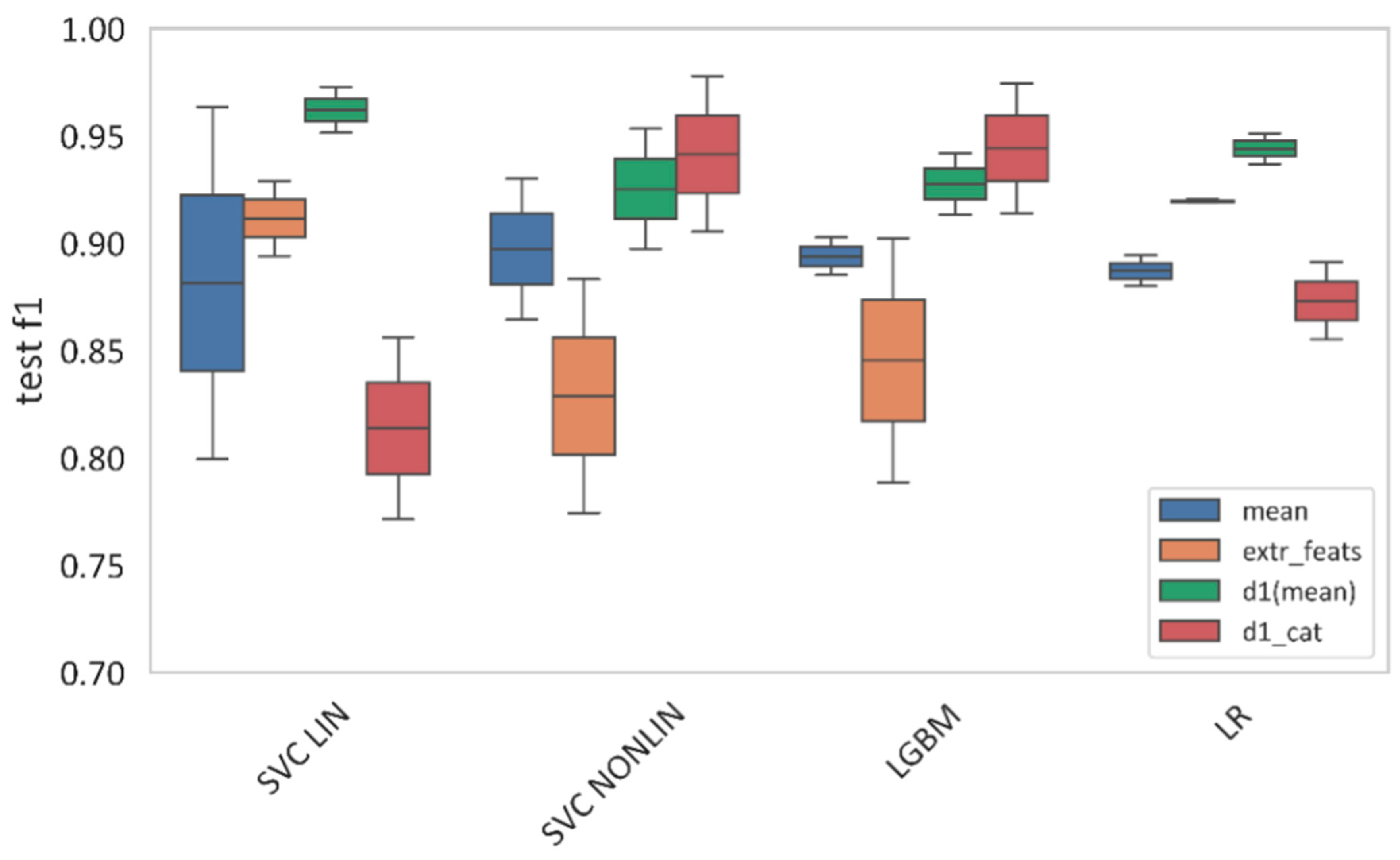 In the case of categorical first-order derivatives, the nonlinear SVM reached F1 = 0.941. The other models performed as follows: LGBM—0.944, linear SVM—0.814, and Logistic Regression—0.873.