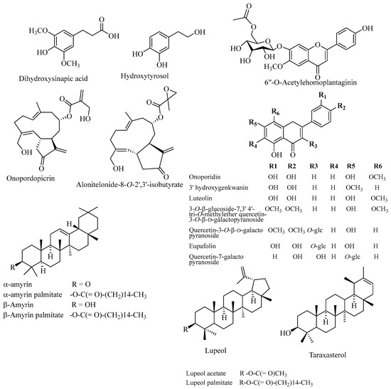 Several chemical compounds have been isolated from S. marianum, which include silymarin, silibinin, isosilychristin, isosilybin A and isosilybin B, silybin A and silybin B, silychristin, silydianin and taxifolin, apigenin 7-O-β-(2″-O-α-rhamnosyl) galacturonide, kaempferol 3-O-α-rhamnoside-7-O-β-galacturonide, apigenin 7-O-β-glucuronide, apigenin 7-O-β-glucoside, apigenin 7-O-β-galactoside, kaempferol-3-O-α-rhamnoside, kaempferol and quercetin [42,43,44], linoleic (35–55%), oleic (24–30%) acids, together with palmitic (8–12%), behenic (3–9%), and other fatty acids and oils (Figure 2 and Table 1). Silybum marianum produces edible oils, protein powder, and forage. It exhibits excellent antioxidant effects, making it very suitable for use in cosmetics to protect the skin [38]. Specifically, silymarin, a major component in the plant, possesses free radical scavenging properties and inhibits lipid peroxidation. It was noted that these properties are likely due to the presence of the β-ring catechol group as well as the donation of hydrogen electrons, which prevents the depletion of free radicals [38,45,46]. Silibinin also showed significant protection by improving the level of superoxide dismutase and reducing the high triglyceride levels in the hepatic system, thereby impeding oxidative damage [47]. Awla et al. [48] reported that silydianin and silychristin in the extract of S. marianum reduced serum triglyceride levels and decreased glucose levels significantly (p < 0.001). These compounds prevented weight gain and normalized blood pressure in a high-fat/high-fructose diet compared to the control group [49]. The oils from S. marianum have the potential to improve the nutritional value of food by providing additional vitamins, proteins, and linoleic acid, as well as low-fat content and low cholesterol levels [38,50,51].