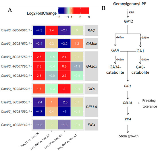 Expression patterns of differentially expressed genes (DEGs) involved in the gibberellin biosynthesis and gibberellin signal transduction pathways. (A) Expression patterns of genes involved in the gibberellin biosynthesis and gibberellin signal transduction pathways; (B) a simplified gibberellin biosynthesis and signal transduction pathway. The treatment groups were defined as follows: Yan_CK and You_CK: the seedlings of ‘Jinyan No 4’ and Jinyou No. 1 were pretreated with distilled water once daily for two days and then grown under normal conditions for 24 h, respectively; Yan_LT and You_LT: the seedlings of ‘Jinyan No 4’ and Jinyou No. 1 were pretreated similarly with distilled water but then exposed to low temperature for 24 h, respectively; Yan_SNP and You_SNP: the seedlings of ‘Jinyan No 4’ and Jinyou No. 1 were pretreated with exogenous SNP (200 μmol · L−1) once daily for two days, then grown under low temperature for 24 h, respectively.