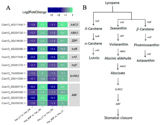 Expression patterns of differentially expressed genes involved in the abscisic acid biosynthesis and abscisic acid signal transduction pathways. (A) Expression patterns of transcripts involved in the abscisic acid biosynthesis and abscisic acid signal transduction pathways; (B) simplified abscisic acid biosynthesis and abscisic acid signal transduction pathways. The treatment groups were defined as follows: Yan_CK and You_CK: the seedlings of ‘Jinyan No 4’ and Jinyou No. 1 were pretreated with distilled water once daily for two days and then grown under normal conditions for 24 h, respectively; Yan_LT and You_LT: the seedlings of ‘Jinyan No 4’ and Jinyou No. 1 were pretreated similarly with distilled water but then exposed to low temperature for 24 h, respectively; Yan_SNP and You_SNP: the seedlings of ‘Jinyan No 4’ and Jinyou No. 1 were pretreated with exogenous SNP (200 μmol · L−1) once daily for two days, then grown under low temperature for 24 h, respectively.