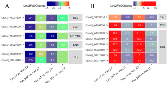 Expression patterns of DEGs involved in flavonoid metabolism (A) and glutathione metabolism (B). The treatment groups were defined as follows: Yan_CK and You_CK: the seedlings of ‘Jinyan No 4’ and Jinyou No. 1 were pretreated with distilled water once daily for two days and then grown under normal conditions for 24 h, respectively; Yan_LT and You_LT: the seedlings of ‘Jinyan No 4’ and Jinyou No. 1 were pretreated similarly with distilled water but then exposed to low temperature for 24 h, respectively; Yan_SNP and You_SNP: the seedlings of ‘Jinyan No 4’ and Jinyou No. 1 were pretreated with exogenous SNP (200 μmol · L−1) once daily for two days, then grown under low temperature for 24 h, respectively.