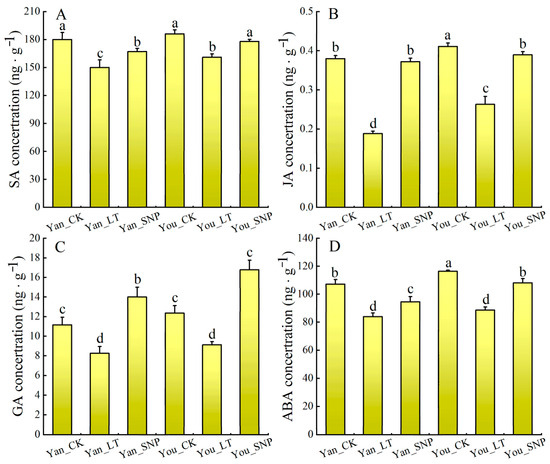 The contents of SA (A), JA (B), GA (C), and ABA (D) in each treatment of cucumber seedlings. The treatment groups were defined as follows: Yan_CK and You_CK: the seedlings of ‘Jinyan No 4’ and Jinyou No. 1 were pretreated with distilled water once daily for two days and then grown under normal conditions for 24 h, respectively; Yan_LT and You_LT: the seedlings of ‘Jinyan No 4’ and Jinyou No. 1 were pretreated similarly with distilled water but then exposed to low temperature for 24 h, respectively; Yan_SNP and You_SNP: the seedlings of ‘Jinyan No 4’ and Jinyou No. 1 were pretreated with exogenous SNP (200 μmol · L −1) once daily for two days, then grown under low temperature for 24 h, respectively. Lowercase letters indicate significant differences at p < 0.05.
