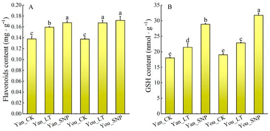 The contents of flavonoids (A) and GSH (B) in each treatment of cucumber seedling leaves. The treatment groups were defined as follows: Yan_CK and You_CK: the seedlings of ‘Jinyan No 4’ and Jinyou No. 1 were pretreated with distilled water once daily for two days and then grown under normal conditions for 24 h, respectively; Yan_LT and You_LT: the seedlings of ‘Jinyan No 4’ and Jinyou No. 1 were pretreated similarly with distilled water but then exposed to low temperature for 24 h, respectively; Yan_SNP and You_SNP: the seedlings of ‘Jinyan No 4’ and Jinyou No. 1 were pretreated with exogenous SNP (200 μmol · L−1) once daily for two days, then grown under low temperature for 24 h, respectively. Lowercase letters indicate significant differences at p < 0.05.