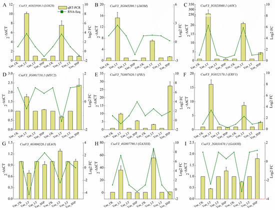 Nine DEGs were selected for qRT-PCR validation (Figure 8), including four involved in JA and MeJA synthesis and signaling (Figure 8A–D), one related to SA regulation (Figure 8E), one associated with ETH signaling (Figure 8F), and three involved in GA synthesis and metabolism (Figure 8G–I). Compared with Yan_CK, the expressed levels of LOS2S (CsaV3_4G023930.1), JAOM (CsaV3_3G045390.1), AOC (CsaV3_5G023060.1), PR1 (CsaV3_7G007620.1), ERFI (CsaV3_3G012170.1), and GA2ox (CsaV3_4G007790.1) were upregulated in Yan_LT. A similar expression pattern was observed in You_LT relative to You_CK. In contrast, GA3ox (CsaV3_2G031670.1) was downregulated in both cultivars under low-temperature stress. Under combined low-temperature and exogenous NO treatment (Yan_SNP and You_SNP), LOX2S was downregulated, while MYC2, PR1, and GA3ox were upregulated compared to low-temperature treatment alone. Notably, JAOM and ACO were downregulated in Yan_SNP vs. You_LT, but upregulated in You_SNP vs. You_LT. These qRT-PCR results are consistent with the RNA-Seq data, confirming the reliability of the transcriptome expression profiles.