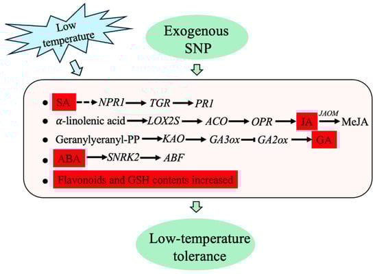 Schematic diagram of low-temperature tolerance in cucumber induced by exogenous SNP. The red box represents hormones or antioxidants.