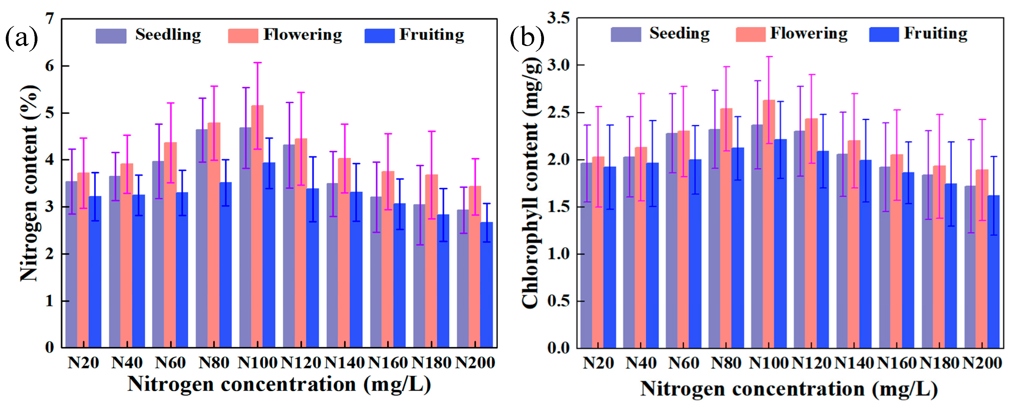 As illustrated in Figure 1, the dynamic patterns of nitrogen and chlorophyll content in tomato leaves demonstrate distinct variations across different growth stages. Comparative analysis reveals a consistent hierarchical pattern: both nitrogen and chlorophyll concentrations display their maximum values during the flowering stage, followed by the seedling stage, with the fruiting stage showing the lowest measurements. During the vegetative to flowering transition, the content of nitrogen and chlorophyll for the leaves exhibited respective growth rates of 10.13% and 10.97%. Notably, these parameters underwent substantial reduction rates of 21.31% and 15.97% during the flowering to fruiting phases. A concentration-dependent response pattern was observed: when the nitrogen concentration in the nutrient solution remained ≤N100 (302.84 mg/L), the incremental nitrogen supply enhanced the leaf nitrogen and chlorophyll content with average growth rates of 7.40% and 9.80% (seedling), 8.49% and 9.72% (flowering), and 5.19% and 11.72% (fruiting), respectively. Conversely, supra-optimal nitrogen concentrations (≥N100) induced progressive depletion, manifesting as average reduction rates of 8.77% and 10.23% (seedling), 8.72% and 8.23% (flowering), and 7.42% and 10.23% (fruiting) for nitrogen and chlorophyll content, respectively.