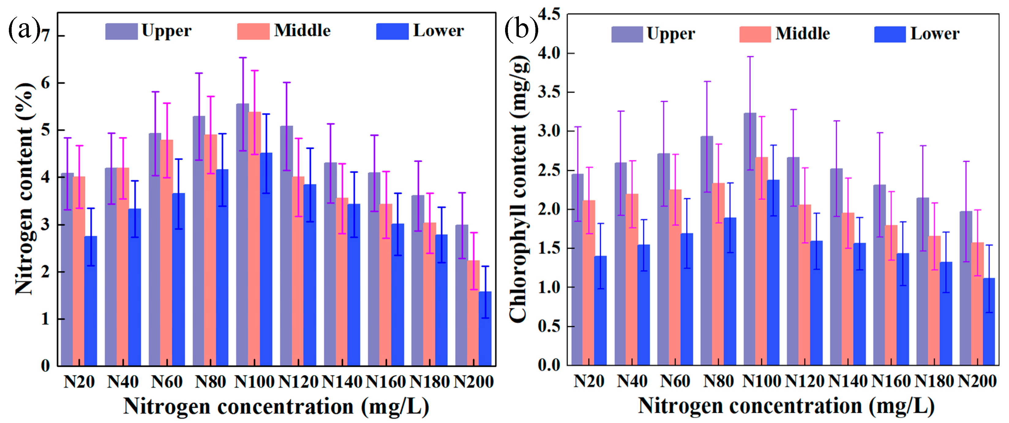 Spatial patterns of nitrogen translocation and remobilization were altered in tomato plants under different nitrogen concentration stresses, leading to spatial gradients in photosynthetic pigment biosynthesis. Figure 2 illustrates the spatial variations and differences in nitrogen and chlorophyll contents across different leaf positions. Both parameters demonstrated a consistent response pattern of upper > middle > lower leaf positions. From upper to middle leaves, nitrogen and chlorophyll contents decreased by 10.43% and 19.56%, respectively. While from middle to lower leaves, the reduction rates reached 16.46% and 22.98%. A concentration-dependent threshold effect was identified: At nitrogen concentrations ≤ N100, an incremental nitrogen supply enhanced leaf constituents with mean growth rates of 8.14% (nitrogen) and 7.17% (chlorophyll) in upper canopy, 7.71% and 6.06% in middle canopy, and 13.38% and 15.65% in lower canopy positions. Conversely, supra-optimal concentrations (≥N100) induced systematic degradation, manifesting as mean reduction rates of 11.57%/9.30% (upper), 15.67%/9.73% (middle), and 17.78%/13.34% (lower) for nitrogen and chlorophyll, respectively.