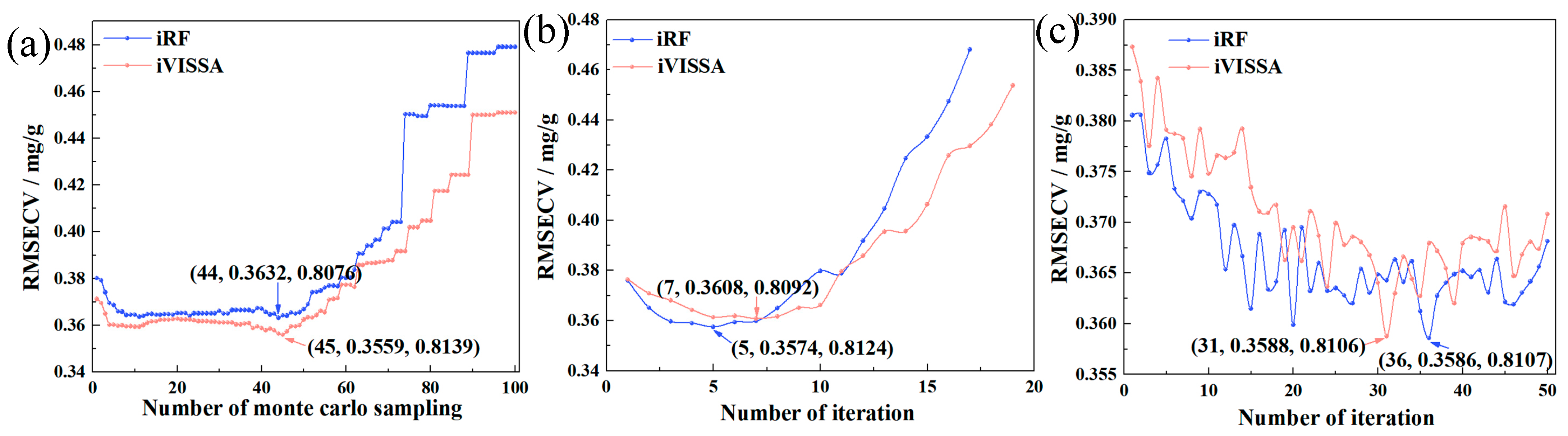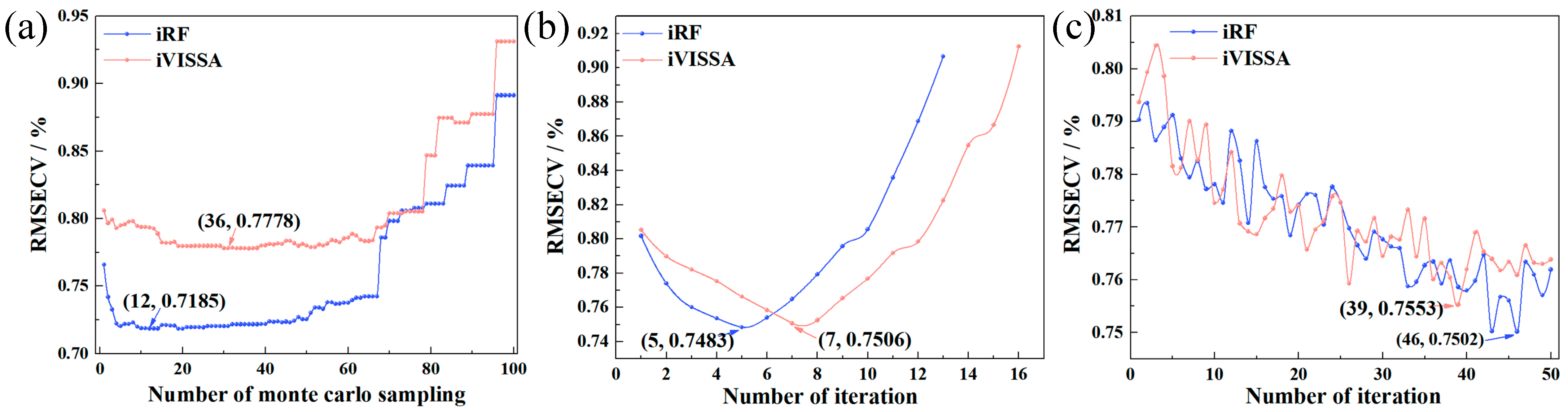 Figure 6. The RMSECV value of extraction process of chlorophyll. (a) CARS; (b) BOSS; (c) VCPA.