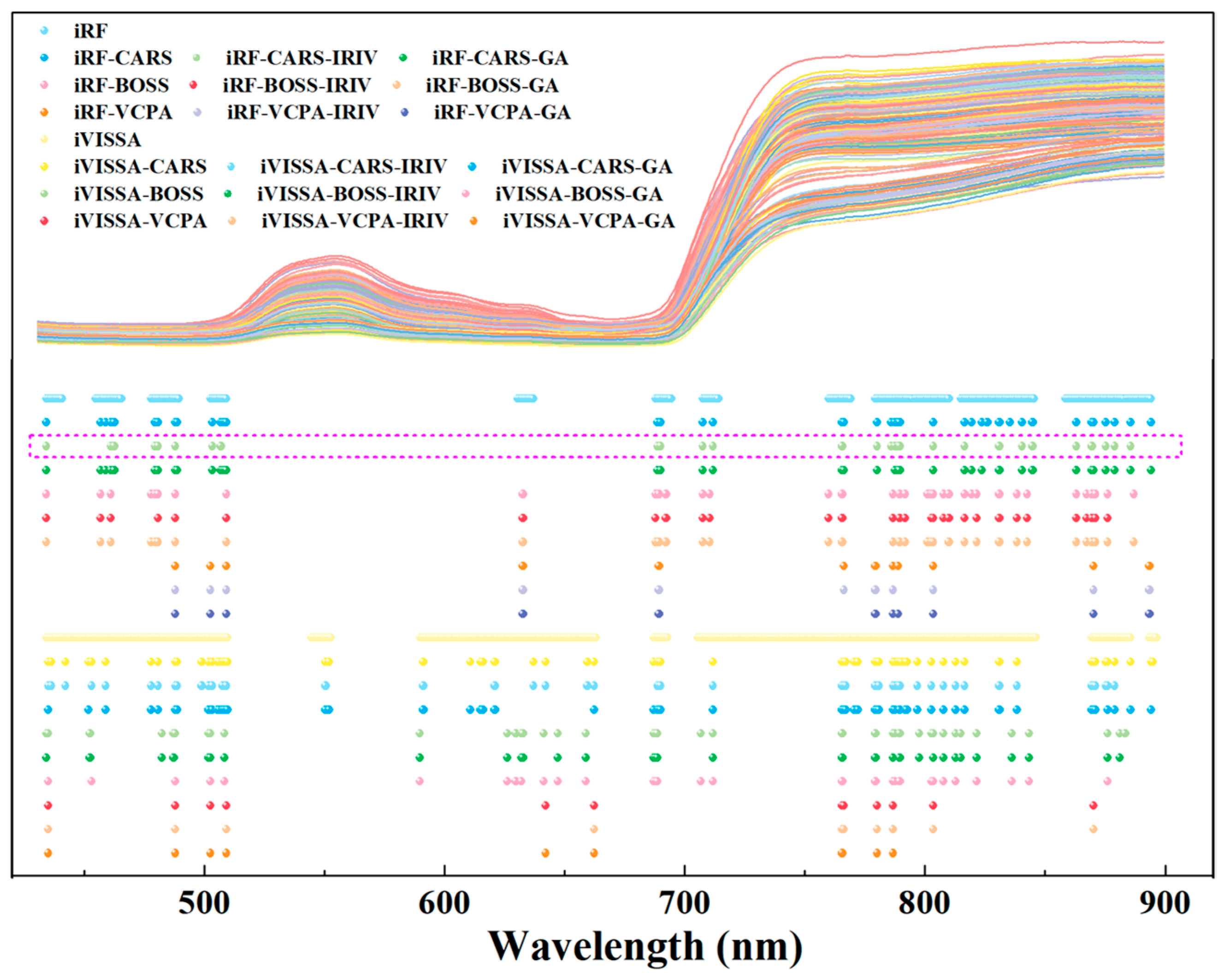 Figure 4. Distribution of key wavelengths resulting from the three-stage feature extraction strategies for nitrogen, ranging from coarse to coarse–fine to coarse–fine–optimal, in tomato leaves. (Note: iRF and iVISSA perform coarse extraction of key wavelengths. CARS, BOSS, and VCPA conduct refined selection from the coarse-extracted wavelengths. IRIV and GA further optimize the selected wavelength sets. The points in the figure represent the distribution of key wavelengths selected by each algorithm for nitrogen detection. The subset highlighted by the pink box indicates the final optimal set of key wavelengths identified through the complete screening process).