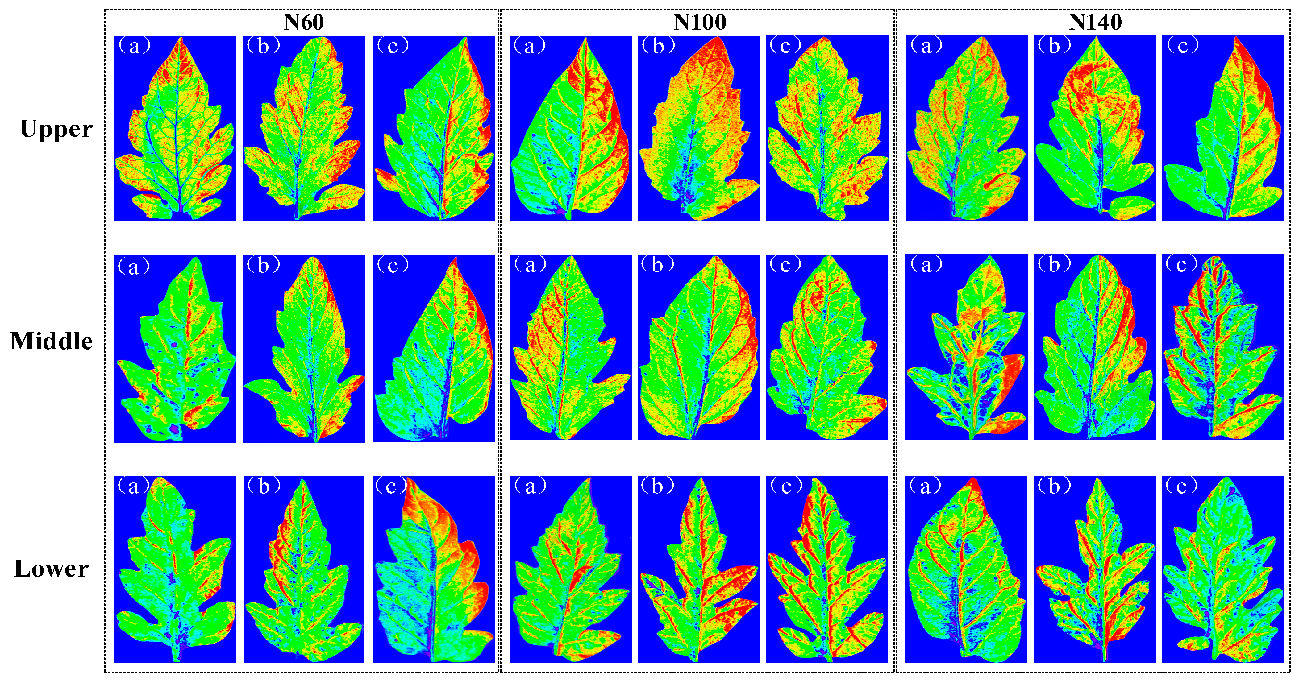 Tomato leaves were systematically sampled from plants subjected to three nitrogen concentrations (N60, N100, and N140) across different growth stages (seedling, flowering, and fruiting) and leaf positions (upper, middle, and lower canopy). The iRF–CARS–IRIV–PLSR nitrogen detection model was employed to process leaf images and visualize nitrogen distribution patterns, as illustrated in Figure 8. The color-coded visualization (blue: 0%; red: 7.64%) revealed significant spatial–temporal variations in nitrogen allocation. Firstly, the nitrogen content varied significantly across different growth stages, with the highest content observed during the flowering period, followed by the seedling stage, and the lowest during the fruiting stage. This indicates that tomato plants exhibit distinct nitrogen demands and utilization efficiencies at different growth stages. Additionally, significant differences were found in nitrogen content across various leaf positions, with the upper leaves showing a higher nitrogen content compared with the middle and lower leaves. This phenomenon is related to nitrogen requirements and distribution patterns during plant growth and development.