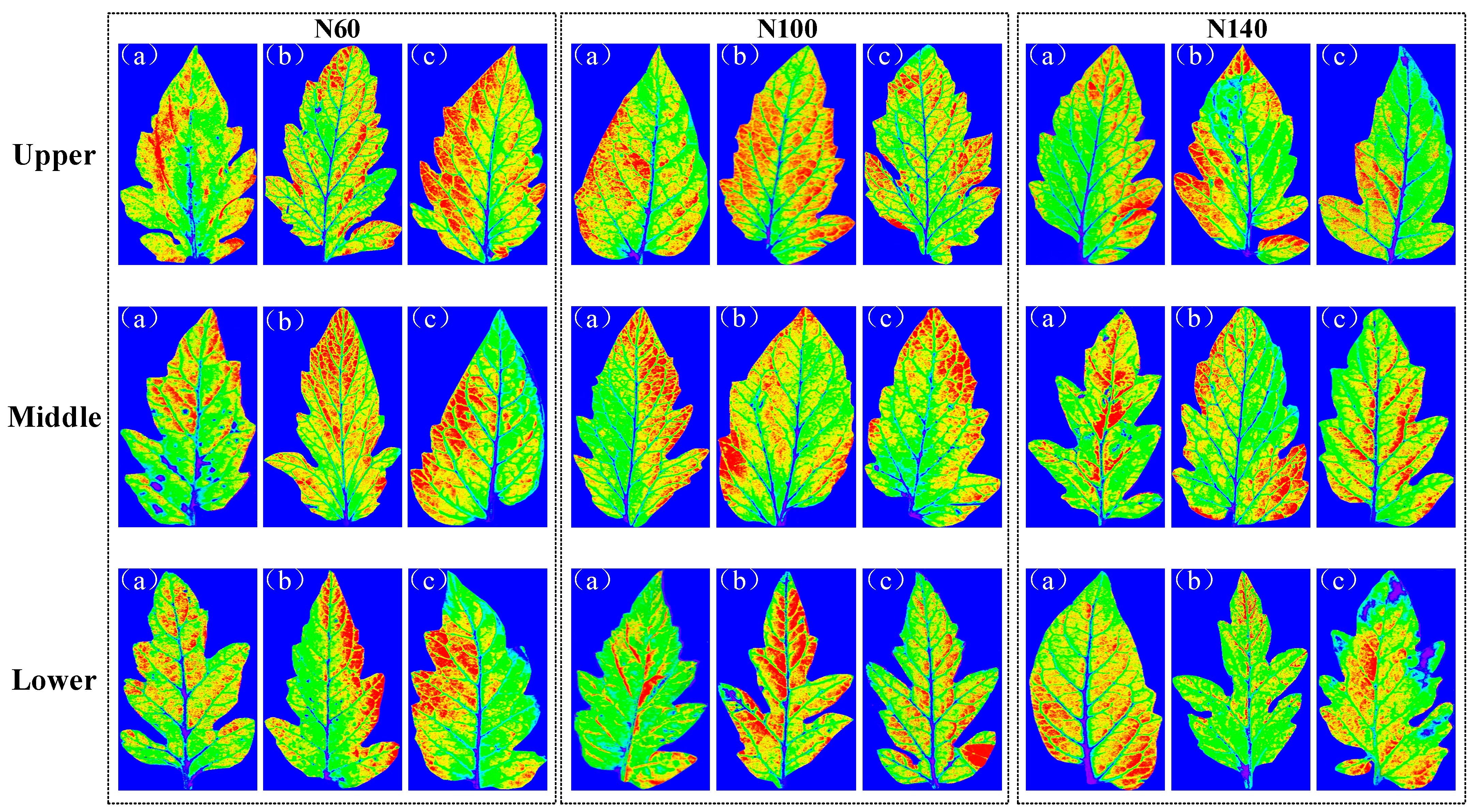 Moreover, under different nitrogen concentration treatments, the highest nitrogen content in the leaves was observed at the N100 concentration, while the nitrogen content at N60 was higher than that at N140. This suggests that the N100 concentration represents the optimal nitrogen level for tomato plant growth, with higher concentrations potentially exerting an inhibitory effect on growth. These findings align with the plant’s growth characteristics and chemical testing results, enabling the clear visualization of nitrogen distribution patterns and contents under different nutrient solution nitrogen concentrations across various growth stages and leaf positions.
