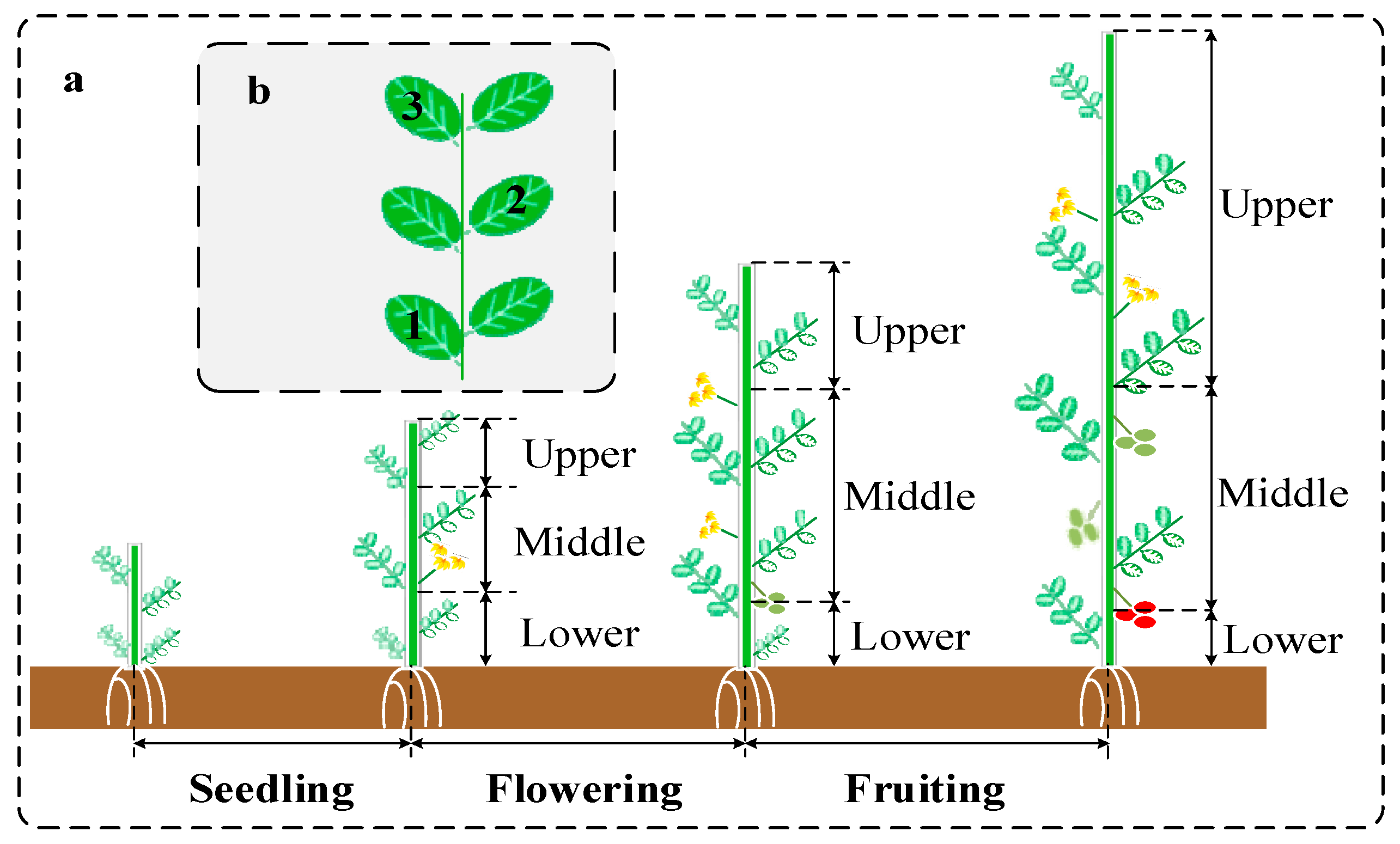 Nitrogen demonstrates high mobility within plant vascular systems, as evidenced by its rapid translocation patterns. In this work, tomato leaf positions were vertically categorized into three distinct strata—upper, middle, and lower layers—through a systematic morphological analysis correlating phyllotaxis with reproductive organ development. Uniform-sized and flat leaves were harvested according to their positions. The distribution of leaves in the upper, middle, and lower canopy layers is shown in Figure 10a, while the sampling pattern for leaves on individual branches is illustrated in Figure 10b. Seventy-eight tomato plants were cultivated during each phenological stage (seedling, flowering, and fruiting stages). Among them, eight plants were allocated to each nitrogen treatment from N20 to N180, and six plants were assigned to the N200 treatment. Using a stratified random sampling method, 245 samples were collected at each growth stage, resulting in a total of 735 samples. Each sample consisted of 6 leaves, bringing the total number of leaves to 4410. Within each growth stage, 25 samples were collected for the N20–N180 treatments and 20 samples for the N200 treatment. All samples from each nitrogen treatment were sequentially numbered, placed in sealed bags, and stored in insulated containers containing dry ice.