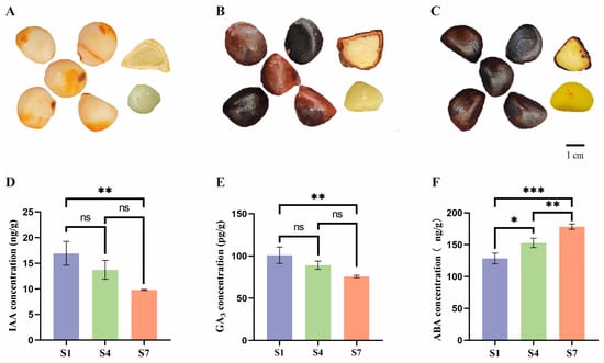 (A) Phenotype of C. drupifera seed kernel at S1 stage. (B) Phenotype of C. drupifera seed kernel at S4 stage. (C) Phenotype of C. drupifera seed kernel at S7 stage. (D) IAA content in C. drupifera fruit. (E) GA3 content in C. drupifera fruit. (F) ABA content in C. drupifera fruit. Blue represents the S1 stage, green represents the S4 stage, and pink represents the S7 stage. (*** p < 0.001, ** p < 0.01, * p < 0.05, ns > 0.05).