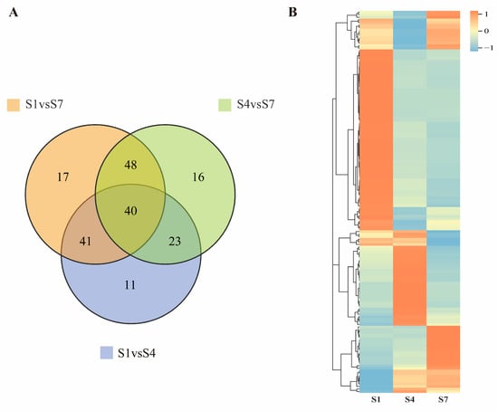 In the three comparison groups (S1 vs. S4, S4 vs. S7, and S1 vs. S7), 115, 127, and 146 differentially expressed genes (DEGs) were identified, respectively (Tables S2–S4). Venn diagram analysis results (Figure 3A) show 11 unique differentially expressed genes (DEGs) in the S1 versus S4 comparison, and a total of 44 unique DEGs across the three control groups. The heatmap (Figure 3B) indicates that more than 57% of DEGs exhibit the highest expression in the S1 group and the lowest expression in the S7 group. Expression of DEGs in the S4 group is lower than in S1 but higher than in S7.