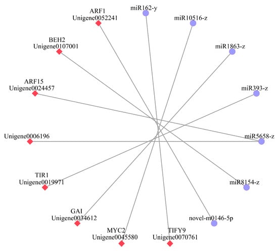 MicroRNAs can bind to target genes to inhibit translation or accelerate degradation, thereby achieving negative regulation of target gene expression. This negative regulatory mechanism is the primary functional mode of microRNAs, serving as a crucial basis for their biological effects. In these negative regulatory microRNA-target gene modules, a total of 7 microRNA-target gene negative regulatory modules were identified (Figure 5). Among them, 6 miRNAs each target a single differentially expressed gene, while 1 miRNA targets multiple differentially expressed genes related to hormone signal transduction in C. drupifera. Specifically, miR162-y negatively regulates TIFY9 (Unigene0070761), miR10516-z negatively regulates MYC2 (Unigene0045580), miR1863-z negatively regulates GAI (Unigene0034612), miR393-z negatively regulates TIR1 (Unigene0019971), miR8154-z negatively regulates BEH2 (Unigene0107001), novel-m0146-5p negatively regulates ARF1 (Unigene0052241), and miR5658-z negatively regulates the expression of both (Unigene0006196) and ARF15 (Unigene0024457).