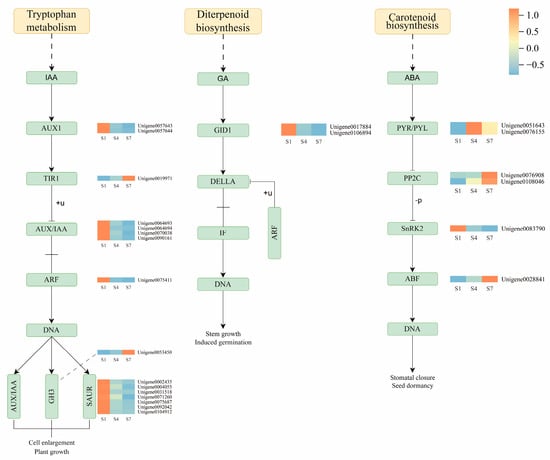 The results indicate that in the IAA signaling pathway, multiple genes involved in IAA synthesis and signal transduction were upregulated during the S1 stage, including the auxin influx carrier AUX1, AUX/IAA family genes, auxin response factor ARF, and SAUR family genes. However, during the S7 stage, the expression of the IAA signaling pathway receptor gene TIR1 and the auxin response gene GH3 was downregulated. In the GA pathway, the gibberellin receptor gene GID1 was upregulated during the S1 stage. In the ABA pathway, the ABA receptor genes PYR/PYL were upregulated during the S4 stage; meanwhile, three genes associated with the negative regulator of ABA signaling, PP2C, and the transcription factor ABF (Unigene0076908, Unigene0108046, Unigene0028841) were upregulated during the S7 stage. In contrast, the SnRK2 kinase gene (Unigene0083790) was downregulated during both the S4 and S7 stages.