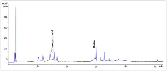 The chromatographic analysis of phenolic compounds in Solanum macrocarpon L. leaf n-butanol extract (SMB) revealed the presence of chlorogenic acid and rutin, as presented in Figure 1, with their quantified concentrations detailed in Table 1. SMB was found to contain a high content of chlorogenic acid (162.39 ± 0.27 mg/g) and rutin (24.61 ± 0.56 mg/g), as determined from the standard calibration curve.
