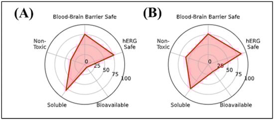 In silico radar plot analysis of key pharmacokinetic and neurotoxicity-related parameters for the selected phenolic compounds: (A) Chlorogenic acid and (B) Rutin. Parameters evaluated include blood–brain barrier permeability, hERG channel safety, general toxicity, aqueous solubility, and oral bioavailability.