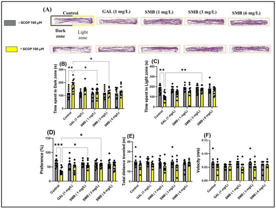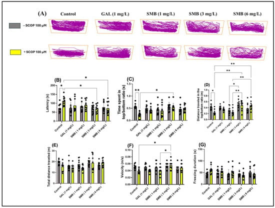 Regarding total distance traveled and freezing duration, no significant differences were observed between the experimental groups (Figure 3E,G), suggesting that SMB does not modify the general locomotor activity of zebrafish at the concentrations used. However, a slight increase in velocity was observed in the groups treated with SMB + SCOP at 3 mg/L compared to the SCOP group (p < 0.05) and compared to SMB + SCOP at 1 mg/L (p < 0.05) (Figure 3F). GAL (1 mg/L) was used as a reference pharmacological agent in the NTT to compare with the effects of SMB treatments.