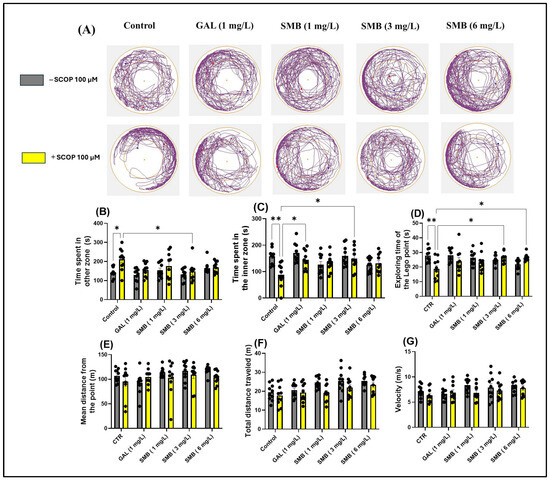 According to post hoc analyses performed using the Tukey test, daily exposure to chronic SMB treatment had a significant impact on anxiety-related behaviors in the NAT in zebrafish. In the SMB + SCOP groups, SMB treatment reduced the time spent in the outer zone, exclusively at the middle concentration (p < 0.05) (Figure 4B), while increasing the time spent in the inner zone (3 mg/L, p < 0.05) (Figure 4C). GAL (1 mg/L), which served as the reference drug in the NAT, also indicated a significant increase in time spent in the inner zone (p < 0.05) (Figure 4C). Simultaneously, in the SMB + SCOP groups, SMB treatment intensified the exploring time of the Lego point, but only at concentrations of 3 and 6 mg/L (p < 0.05) (Figure 4D). Post hoc Tukey analyses, however, did not detect any effect of the treatment on the mean distance from the Lego point (Figure 4E). Furthermore, SMB treatment did not modify the locomotor activity of zebrafish in the NAT (Figure 4F,G). An increase in hyperlocomotion behavior because of acute SCOP treatment was observed (p < 0.05) (Figure 4B).