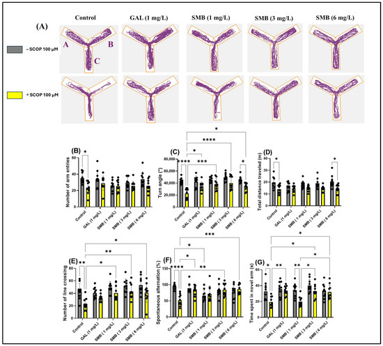 The use of the Y-maze allowed the evaluation of the effects of SMB administration on the tendency of zebrafish to explore novel environments and, specifically, on spatial memory. Monitoring the trajectories of zebrafish treated with SCOP highlighted significant deficits in exploratory response to unfamiliar environments, manifested by a reduction in activity in the new arm of the maze (Figure 6A). In contrast, chronic administration of SMB and acute GAL administration led to a significant increase in activity in this arm, suggesting a beneficial effect on exploratory behavior.