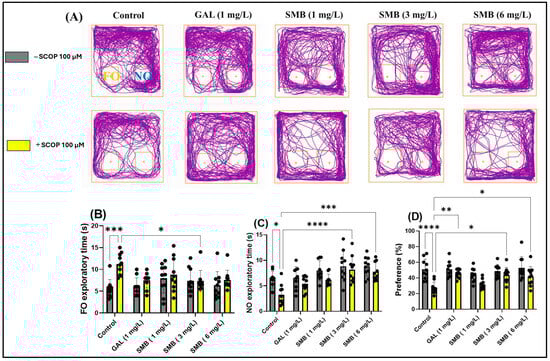 Post hoc Tukey test showed that treatment with SCOP significantly increased the time spent exploring FO (p < 0.001) (Figure 7B), while simultaneously reducing the time spent exploring NO (p < 0.05) (Figure 7C) and preference percentage for NO (p < 0.0001) (Figure 7D). In contrast, chronic treatment with SMB administered daily to zebrafish had a significant effect on the time spent exploring FO, only at the 3 mg/L concentration (p < 0.05) (Figure 7B). However, regarding the exploration time of NO, both the 3 mg/L (p < 0.001) (Figure 7C) and 6 mg/L (p < 0.001) (Figure 7C) concentrations proved to be effective, along with a significant increase in preference percentage for NO, in a similar manner for both previously mentioned concentrations (p < 0.05) (Figure 7D). Additionally, GAL (1 mg/L), used as a reference in the NOR test, increased preference percentage for NO (p < 0.01) (Figure 7D).