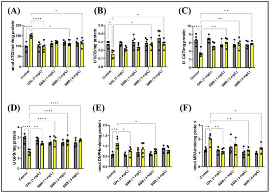 The enzymatic activity of AChE in the zebrafish brain was meticulously investigated to elucidate the mechanisms by which SMB mitigates memory deficits induced by acute exposure to SCOP at a concentration of 100 μM. A statistical evaluation using two-way ANOVA indicated a significant influence of the treatment on AChE activity [F(1, 40) = 8.138, p = 0.0068], as shown in Figure 8A. Acute administration of SCOP before euthanasia led to a substantial increase in AChE activity in the zebrafish brain when compared to the control cohort (p < 0.0001), suggesting cholinergic dysfunction associated with cognitive impairment. In contrast, SMB administration resulted in a notable decrease in enzymatic activity, with a particularly pronounced effect at concentrations of 3 and 6 mg/L (p < 0.05) when compared to the group treated exclusively with SCOP (Figure 8A). GAL, at a concentration of 1 mg/L, also reduced AChE activity in the brain of zebrafish exposed to acute SCOP action (p < 0.0001) (Figure 8A).