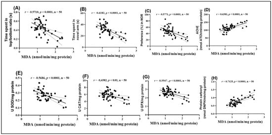 All results were expressed as mean ± standard error of the mean (S.E.M.). Comparison between groups was performed using one-way analysis of variance (ANOVA), followed by Tukey’s post hoc test to identify significant differences based on treatment. The statistical significance threshold was set at p < 0.05. Statistical analyses were conducted using GraphPad Prism 9.4 software (GraphPad Software, Inc., San Diego, CA, USA). Additionally, correlations between behavioral parameters, enzymatic activities, and lipid peroxidation levels were evaluated using the Pearson correlation coefficient (r) to explore potential relationships between the investigated variables.