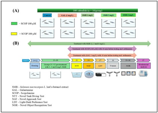 - Brinza, I.; Guliev, C.; Oresanya, I.O.; Gok, H.N.; Orhan, I.E.; Hritcu, L. Solanum macrocarpon L. Ethanolic Leaf Extract Exhibits Neuroprotective and Anxiolytic Effects in Scopolamine-Induced Amnesic Zebrafish Model. Pharmaceuticals 2025, 18, 706. [Google Scholar] [CrossRef]