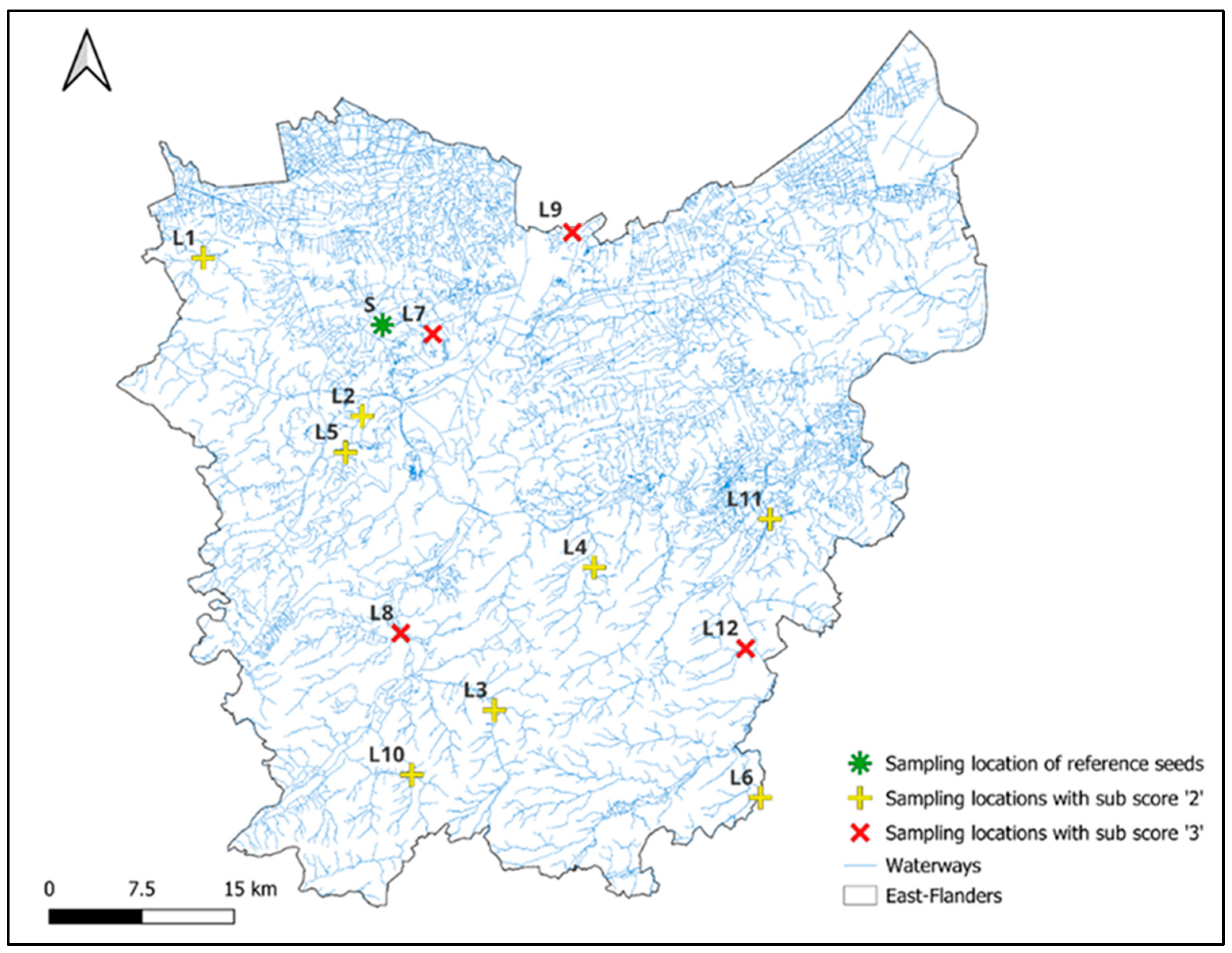 These concerns are particularly relevant in Flemish streams, where sediment pollution remains a persistent challenge due to historical pollution [19]. Although sediment contamination has generally declined since 2000 in response to improved water quality, many streambeds remain polluted [19,20]. This contrast reflects the long-term persistence of contaminants in sediments, where substances can accumulate and remain bound for decades, even after concentrations in the surface water have declined [21]. According to the most recent biomonitoring cycle (2016–2021), only 31% of stream sediments in Flanders were classified as unpolluted by the Flemish Environment Agency [19]. Consequently, sediment toxicity may continue to constrain vegetation recovery, even in streams where the chemical water quality has improved. Despite growing awareness of this issue, direct experimental evidence linking sediment contamination to macrophyte germination remains scarce [22]. This study addresses this gap by examining how varying levels of sediment contamination affect the natural germination of submerged aquatic macrophytes in streams across Flanders. We hypothesize that (1) higher sediment contamination levels will reduce germination success and seedling establishment, and (2) that these effects will be detectable at both experimental and landscape scales.