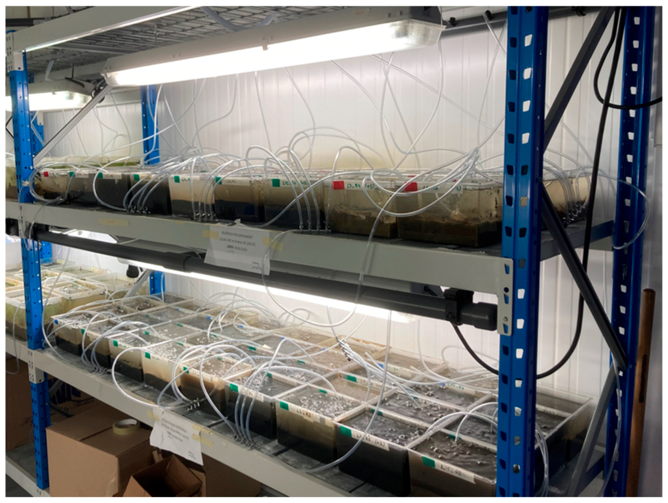 The interval between field sampling and completing the experimental set-up did not exceed 48 h. During this period, the sediment was kept moist and was stored in a cold room (5 ± 1 °C) overnight. Figure 2 illustrates the set-up for one of the 72 aquaria in the experiment. An image of the complete set-up is provided in Figure 3.
