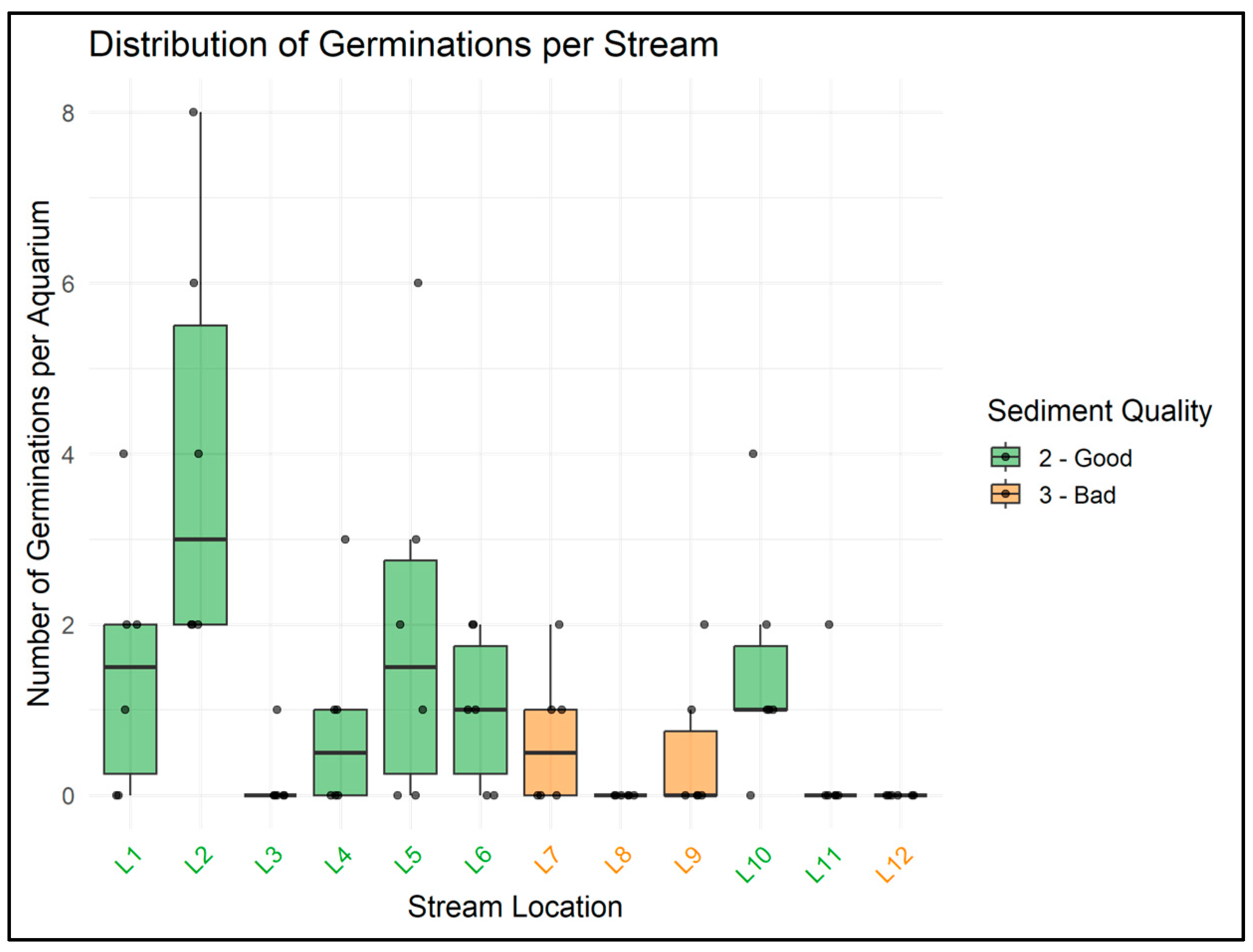 Figure 5. Germination counts per stream, grouped by sediment quality score (2 = Good, 3 = Bad). Boxes indicate interquartile ranges and medians, whiskers extend to 1.5x the interquartile range, and points represent individual aquaria. Although some variation was observed among streams, the overall pattern of lower germination in sediments of lower quality (score 3) was consistent.