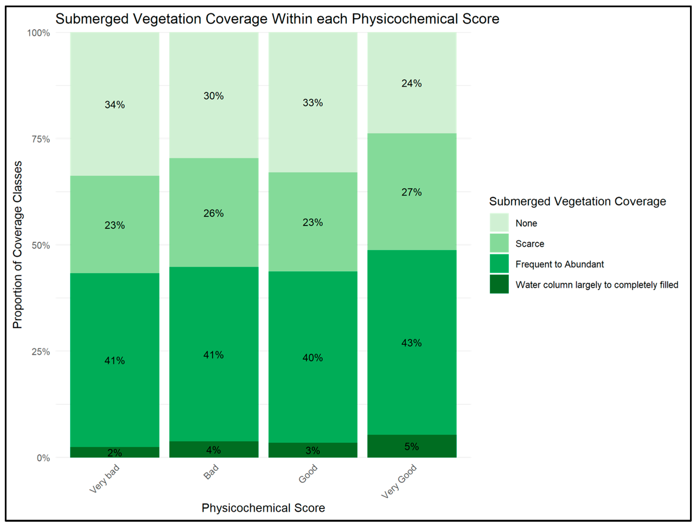 Figure 6. Stacked proportional bar plot showing the relative distribution of submerged vegetation coverage categories across sediment physicochemical classes. Bars are ordered from highest to lowest vegetation coverage, and percentages are annotated for clarity. The distribution of vegetation coverage did not differ significantly across sediment physicochemical classes.
