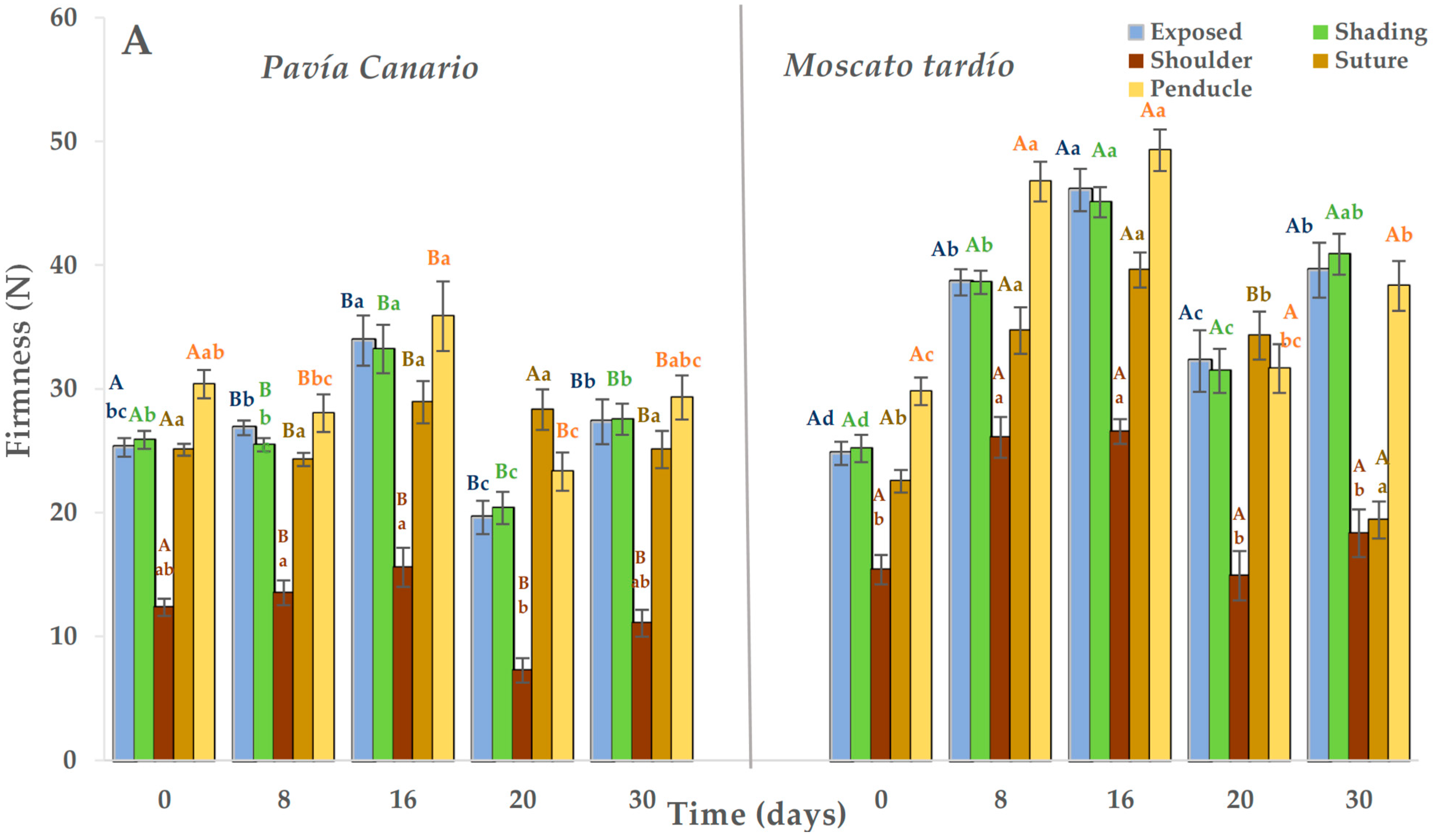 Figure 2B). The evolution of firmness over time showed that firmness of the exposed side of Pavía Canario increased at 16 + 5 days and was maintained until 30 + 5 days. A progressive increase was also observed on the shaded side, suture, and peduncle, reaching the maximum value at 30 + 5 days. In Moscato tardío, the values measured at 8 + 5 days were higher than those measured at 16 and 20 + 5. Also, the maximum values were reached after 30 + 5 days in all the measured areas.