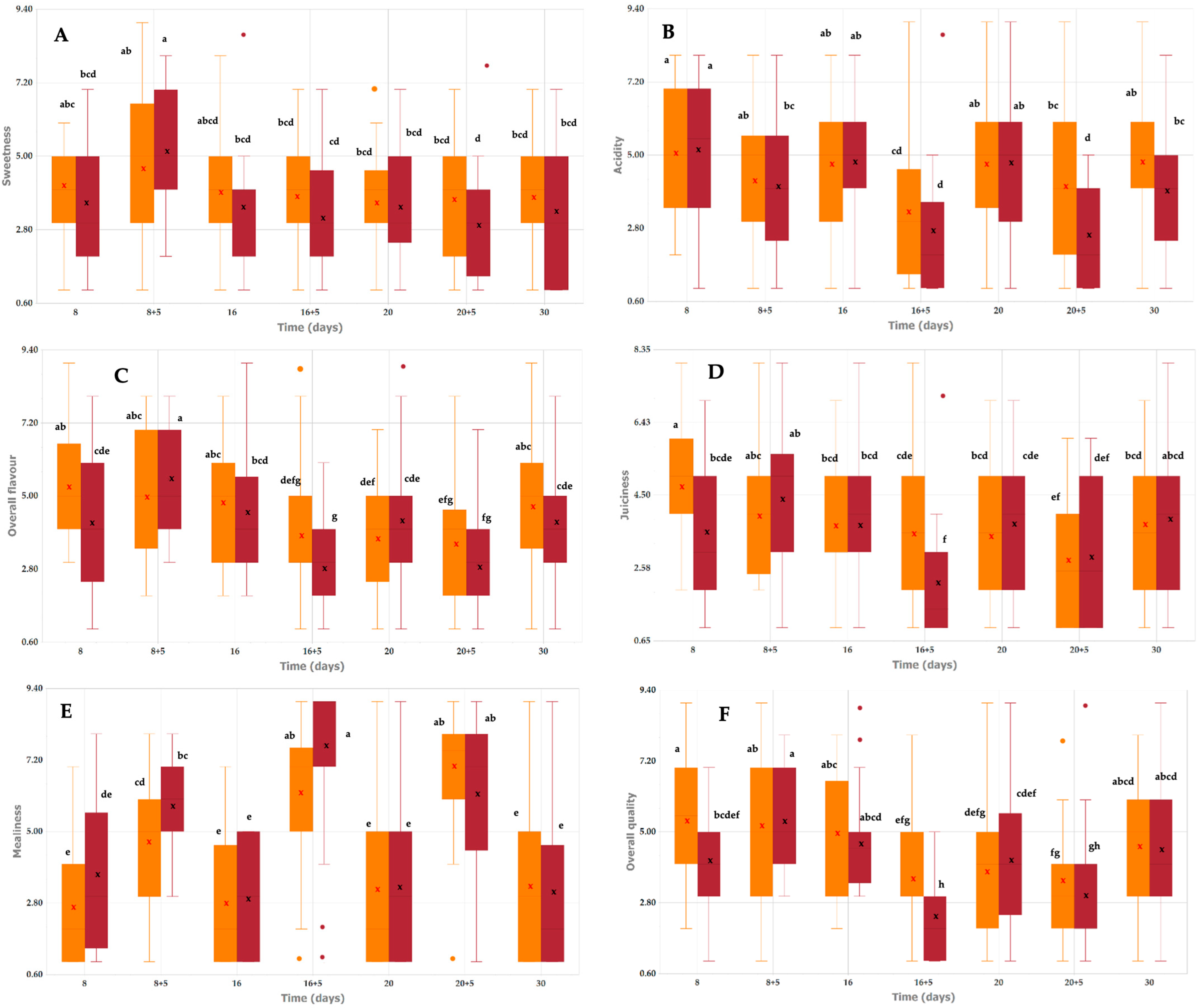 50], who found that nectarines stored at lower temperatures were perceived as more acidic and less sweet than freshly harvested fruit, highlighting the influence of intrinsic fruit attributes over panelist-related factors in determining overall acceptance.