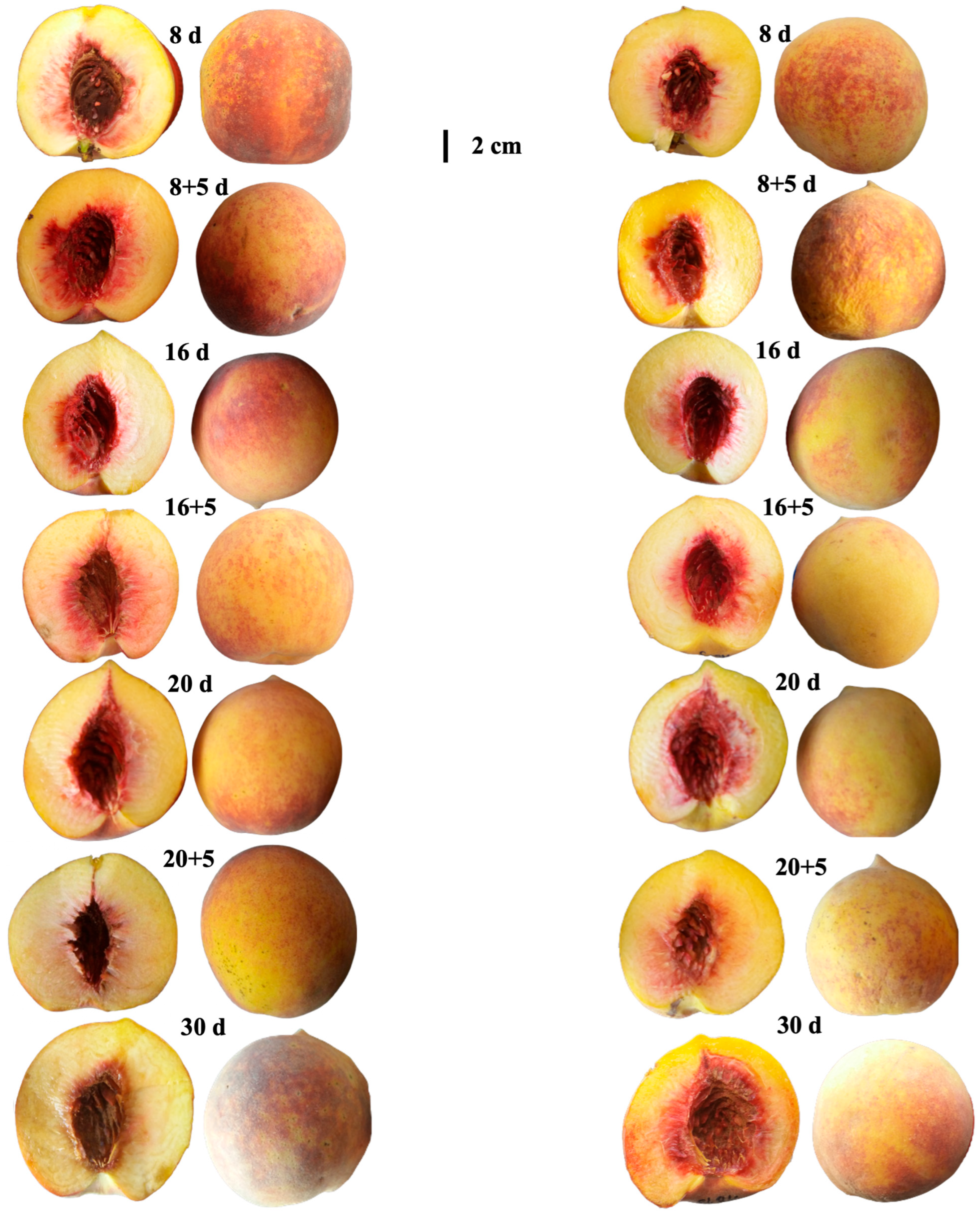 16]. According to the response of peach fruits to storage at temperatures of 0 or 5 °C for different periods, they can be classified into three categories: not susceptible to chilling and insensitive to temperature; not susceptible to cold, resistant to at least 5 weeks of storage at 0 °C but susceptible to cold (<5 weeks of storage) at 5 °C (temperature sensitive); and, finally, susceptible to cold (<5 weeks of storage) in both storage temperatures [