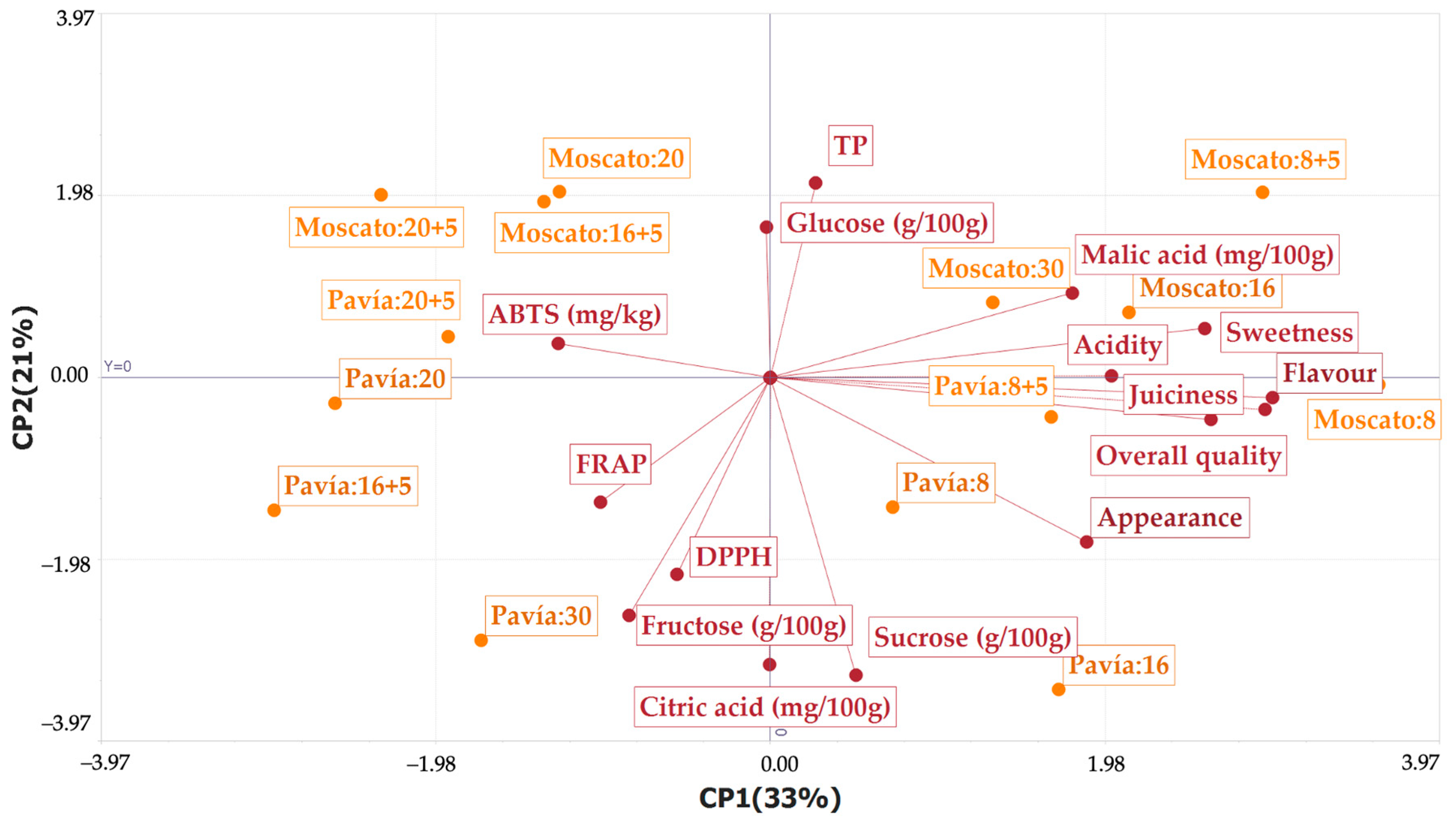Regarding sample distribution, Moscato fruits stored for 8, 30, and 8 + 5 days, as well as Pavía 8 + 5, were located in the positive region of PC1, being associated with greater juiciness, flavor, and overall quality. In contrast, Pavía fruits stored for 16 + 5 and 30 days appeared in the negative region of PC1, showing higher FRAP, DPPH, and fructose values. Pavía fruits stored for 20 and 20 + 5 days exhibited higher antioxidant capacity as measured by ABTS, but lower juiciness and sweetness. Moscato fruits stored for 16 + 5 and 20 days were positioned near the PCA origin, showing intermediate values in both sensory attributes and antioxidant capacity. Overall, the PCA differentiated the two varieties, with Moscato characterized by positive sensory attributes and Pavía associated more with antioxidant capacity, albeit with lower sensory quality. These results allow a clear characterization of Moscato Tardío and Pavía Canario peaches, which can guide the selection of cultivars for direct consumption or processing based on their post-harvest performance.