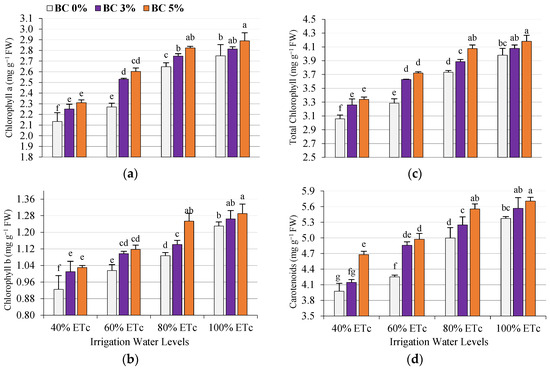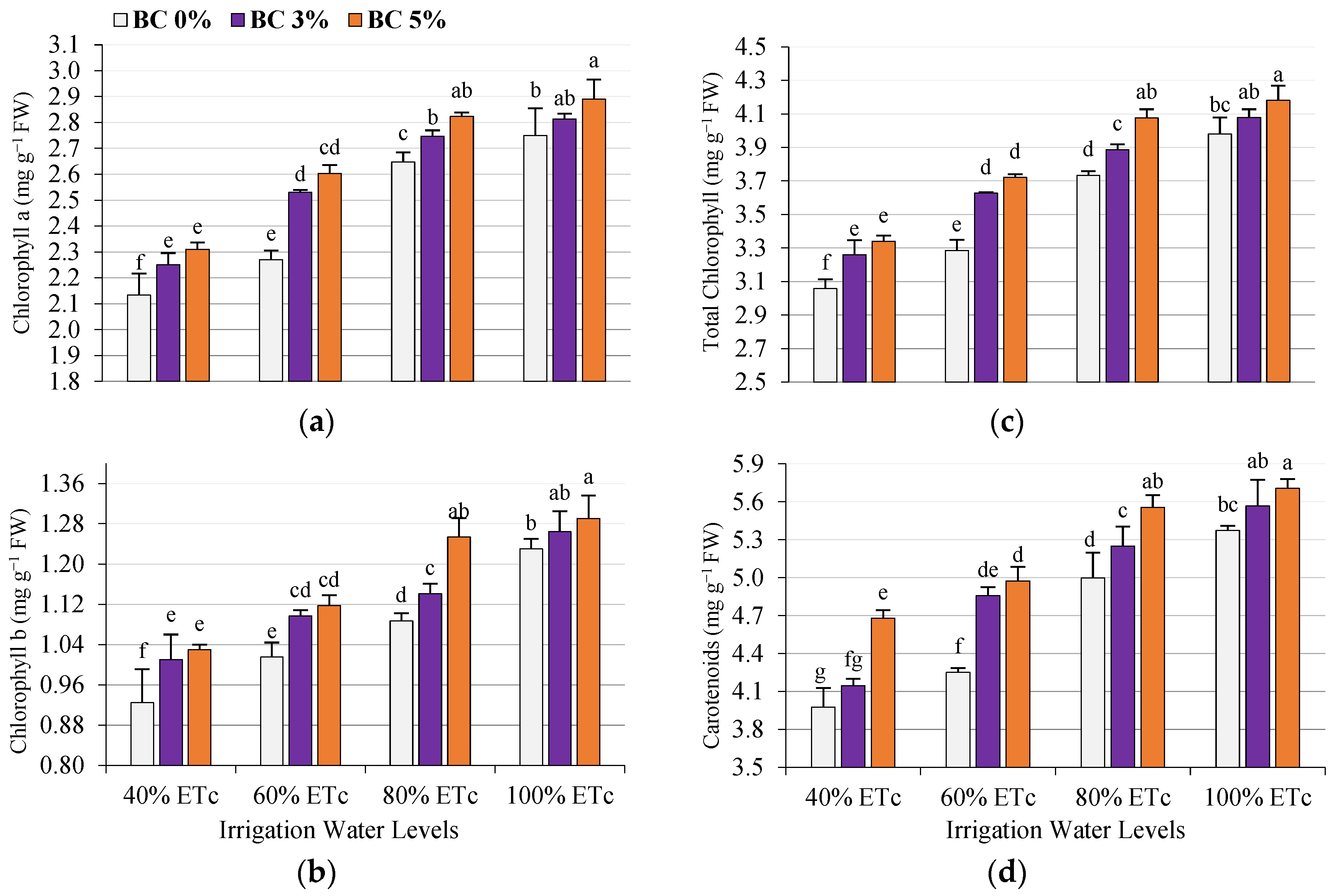 2.3. Effects of Biochar on Photosynthetic Pigments of Tomato Plants Grown Under Water Deficit Conditions