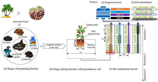 - Usman, M.; Ahmad, N.; Raza, W.; Zhao, Z.; Abubakar, M.; Rehman, S.U.; Ikram, S.; Tariq, H. Impact of biochar on the yield and nutritional quality of tomatoes (Solanum lycopersicum) under drought stress. J. Sci. Food Agric. 2023, 103, 3479–3488. [Google Scholar] [CrossRef]